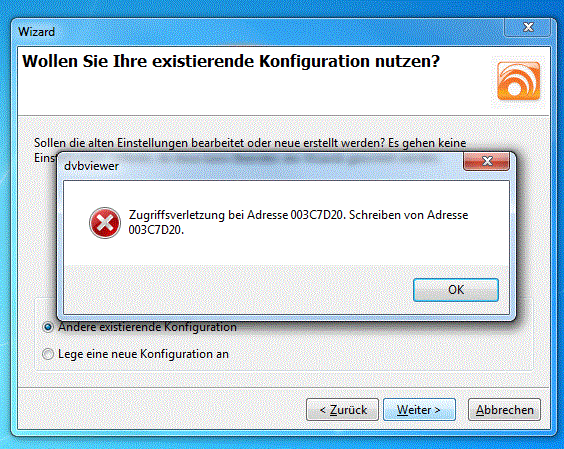 cpg Posted January 1, 2012 Posted January 1, 2012 Moin, ich habe das gleiche Problem - nach Installation einer neuen Grafik-Karte. Wenn ich das Support-Tool aufrufe, kommt die Fehlermeldung: Zugriffsverletzung Adr. 001BCD20. Hast Du diese Fehlermeldung auch gehabt? So komme ich im Moment nicht weiter. Neu-Installation des DVB-Viewers und Reinigung der Registry (XP) haben nichts gebracht. Gruß CPG Quote