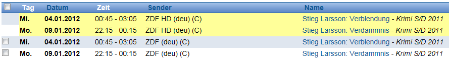 test Posted January 3, 2012 Posted January 3, 2012 (edited) Hi Lars, anbei ein Screenshot. Der wurde erstellt, nach: EPG Suche -> Stieg Larson Kannst aber auch nach irgendwas anderem suchen was an mehr als einem Tag läuft/matched und nicht auf dem gleichen Sendern läuft. Ich würde erwarten, daß das nach Datum sortiert ist, ist es aber nicht. Kann man das per default ändern, oder anders: kann ich das für meine Installation irgendwie ändern falls Du den Default nicht ändern möchtest? Danke! Edited January 3, 2012 by test