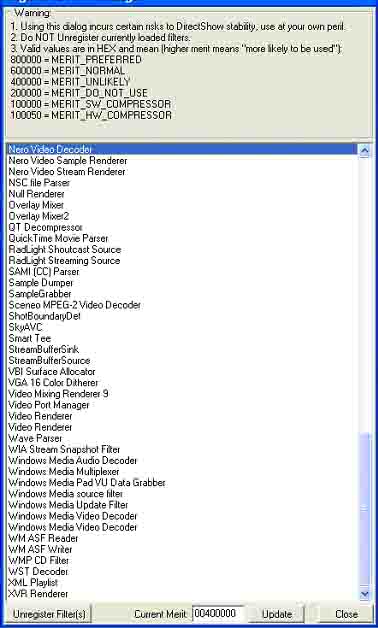 Henk Posted September 21, 2004 Author Posted September 21, 2004 Thanks again, Steffen! I used the ZoomPlayer to unregister the filters you mentioned above (Frauenhofer AV & Nero digital audio) as I didn't have the Radlight Filter Manager you mentioned. There are plenty of filters left now (pls. see attached image) -- do I need them all? I'm using mainly the Intervideo A/V filters with the DVBViewer. Thanks for your help m8! Henk Quote