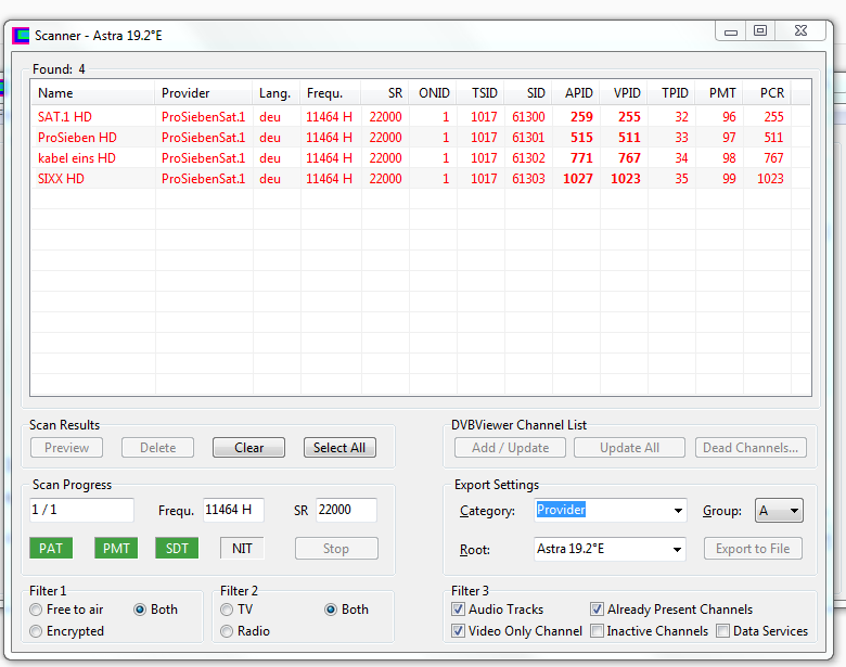 pebedu Posted January 22, 2012 Posted January 22, 2012 (edited) @Derrick, scann geht bis 11700, benutze ein Quadroswitch LNB, habe nun mal den Stick an eine Schüssel mit single LNB angeschlossen, kein Unterschied, scann mit Transedit auch nur bis 11700. sonst bleibt es bei den vorherigen Problemen. Habe anschließend mal an einem anderen Rechner mit einer Skystar 2 Dvbviewer4.9.0 und Recordingservice 1.9.3.0 installiert,dort funktioniert alles fehlerfrei . Edited January 22, 2012 by pebedu