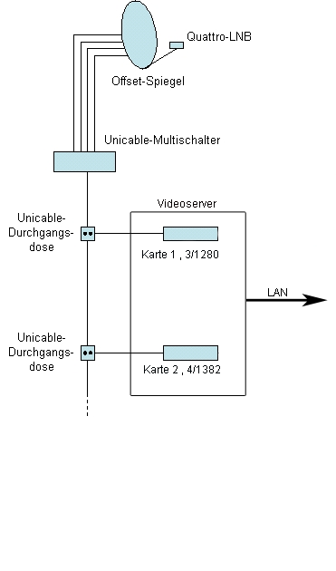 oelhahn Posted March 11, 2012 Author Posted March 11, 2012 Hast du überhaupt den beitrag von @stoni007 richtig gelesen? Er fragte nach den unicable-einstellungen, die deine hardwarekonfiguration zeigt. Hast du unicable und wenn ja ist das richtig konfiguriert? Ja, das mit dem Lesen ist so 'ne Sache... , da wäre diese Antwort fast nicht nötig gewesen. Nun, wie auch immer... Karte 1 Dose 1 Unicable 3 1280 Karte 2 Dose 2 Unicable 4 1382 Zur Verdeutlichung: Der Videoserver ist an einen handelsüblichen GigaBit-Switch angeschlossen, wie die anderen PC's auch. JETZT sollte's wohl klar sein...