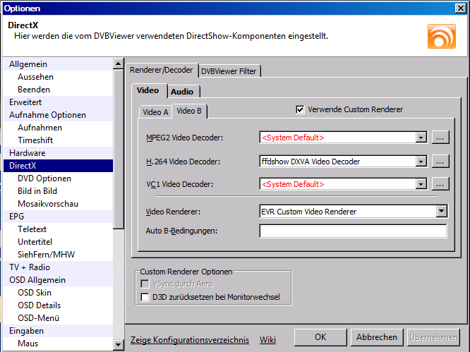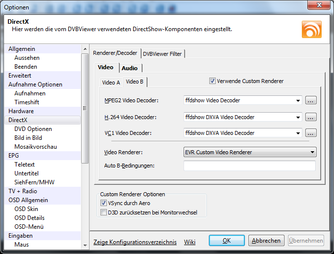 Ich würde das trennen. Video A konfigurierst mit einem DXVA-fähigen Decoder (aber nicht ffdshow DXVA, das passt mit dem DVBViewer Filter nicht zusammen). Und Video B für MKV Untertitel, d.h. ffdshow ohne DXVA. Wenn du als Auto B-Bedingung .mkv einträgst, verwendet der DVBViewer bei MKVs automatisch Video B.
