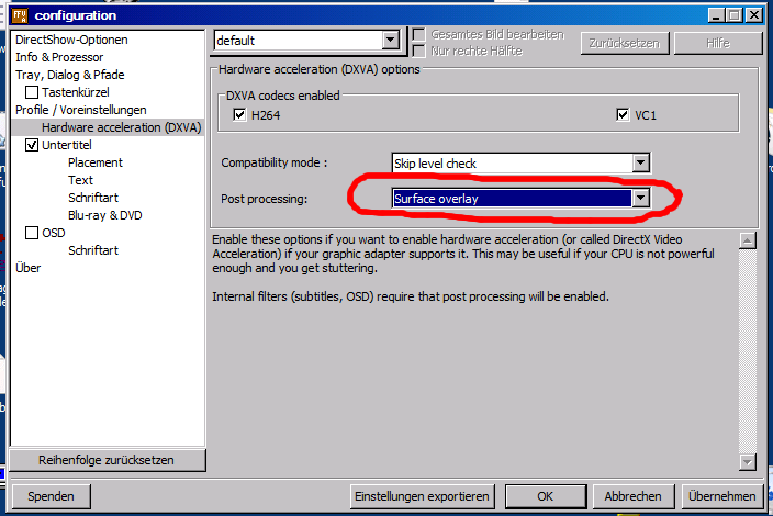 Eingerichtet wie im wiki beschrieben (surface overlay in ffdshow dxva aktivieren usw.)!
