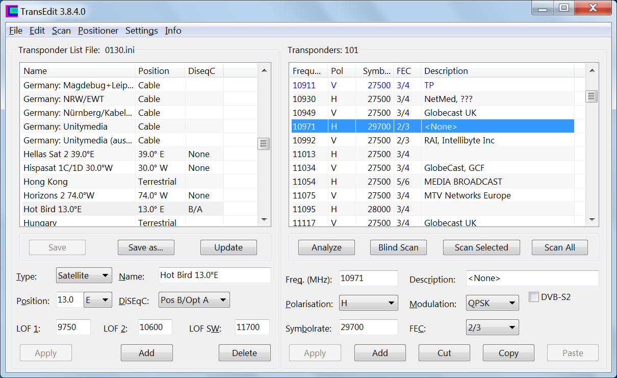 Griga Posted April 20, 2012 Posted April 20, 2012 Die Empfangsparameter in deiner Transponderliste sind falsch bzw. veraltet. Angehängt eine aktuelle Transponderliste von Hotbird. Diese im Konfigurationsordner, Unterordner Transponders speichern (sie Info -> Configuration Folder in TransEdit, Programm danach neu starten, eventuell DiSEqC für die Liste passend einstellen, falls bei dir nötig). Danach sollte es gehen. Ich nehme an, du hast die Sender im DVBViewer mit "gründlicher Suche" gefunden? Mit deiner alten Transponderliste allein wäre es dir nicht gelungen. Hot Bird 13E.ini Quote
