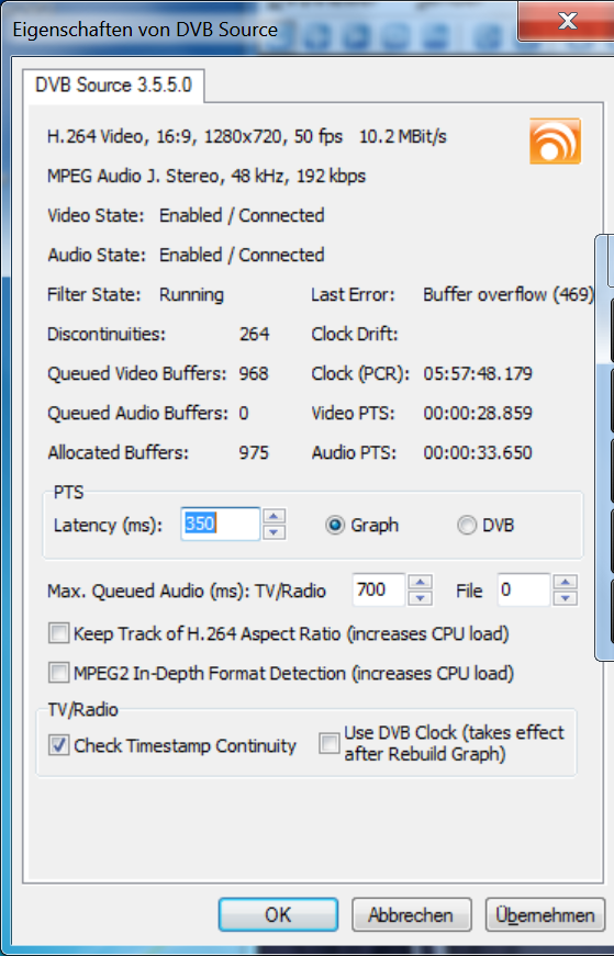 awehring Posted April 20, 2012 Author Posted April 20, 2012 Danke für die Rückfrage. In den DVB Source Eigenschaften werden innerhalb von 2 - 3 Minuten einige hundert Discontinuities angezeigt. Dann springen sie auf Null und der Buffer Overflow Wert steigt an. Ein typisches Bild ist im Anhang. Der Anstieg der Discontinuities erfolgt übrigens in grösseren Sprüngen (jeweil plus 70 oder 80), aber NICHT in dem Moment in denen das Bild einfriert, sondern recht unregelmässig. Die Support.zip ist übrigens im ersten Beitrag, wenn Du da reinschauen willst. Quote