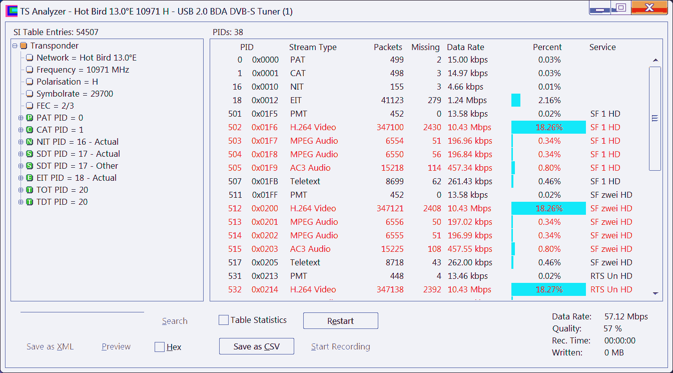 awehring Posted April 20, 2012 Author Posted April 20, 2012 (edited) Die Empfangsparameter in deiner Transponderliste sind falsch bzw. veraltet. Angehängt eine aktuelle Transponderliste von Hotbird. Diese im Konfigurationsordner, Unterordner Transponders speichern (sie Info -> Configuration Folder in TransEdit, Programm danach neu starten, eventuell DiSEqC für die Liste passend einstellen, falls bei dir nötig). Danach sollte es gehen. Ich nehme an, du hast die Sender im DVBViewer mit "gründlicher Suche" gefunden? Mit deiner alten Transponderliste allein wäre es dir nicht gelungen. Gut, Danke, einen Schritt weiter. Mit der neuen Transponderliste kann ich die Analyse machen. Ergebnis: Es gibt viele "Missings". Ausserdem ist die Quality (rechts unten) nur 57 %, bei anderen Transpondern ist sie mindesten2 65 %. Ist das die Empfangsstärke? PS: Mit ider ihne CAM (ausgesteckt) macht keinen Unterschied Edited April 20, 2012 by awehring Quote