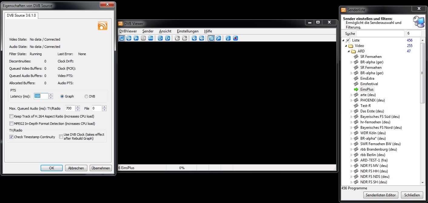 dasgunn Posted March 16, 2012 Author Posted March 16, 2012 (edited) Hast du nach dem Update neu nach Hardware suchen lassen? http://de.DVBViewer.tv/wiki/Optionen_Hardware#Suche_Ger.C3.A4te Hat leider nichts gebracht. Ich habe sogar die beide Geräte deinstalliert (aus der Liste gelöscht) und neu suchen bzw. finden lassen. Was wird unter Ansicht > Filter > DVB Source angezeigt wenn kein Bild kommt? http://www.DVBViewer.com/griga/DVBSource%20D/DVBSource.html Screenshot ist im Anhang. Am besten 3-4 mal den DVBViewer über Startmenü > Programme > DVBViewer > Support > Debug Mode starten und versuchen einen Sender einzustellen oder einen Sendersuchlauf zu machen. Werden Sender gefunden? Und dann nochmal ein support.zip erstellen eventuell findet man im debug.log irgendwas. Support.zip ist im Anhang. Nach dem zweiten Start war das Bild wieder da, nach einem Senderwechsel allerdings wieder weg. Auch beim dritten Start war kein Bild und Ton. Ich hoffe ihr könnt mir einen Tipp geben. support2.zip Edited March 16, 2012 by dasgunn Quote