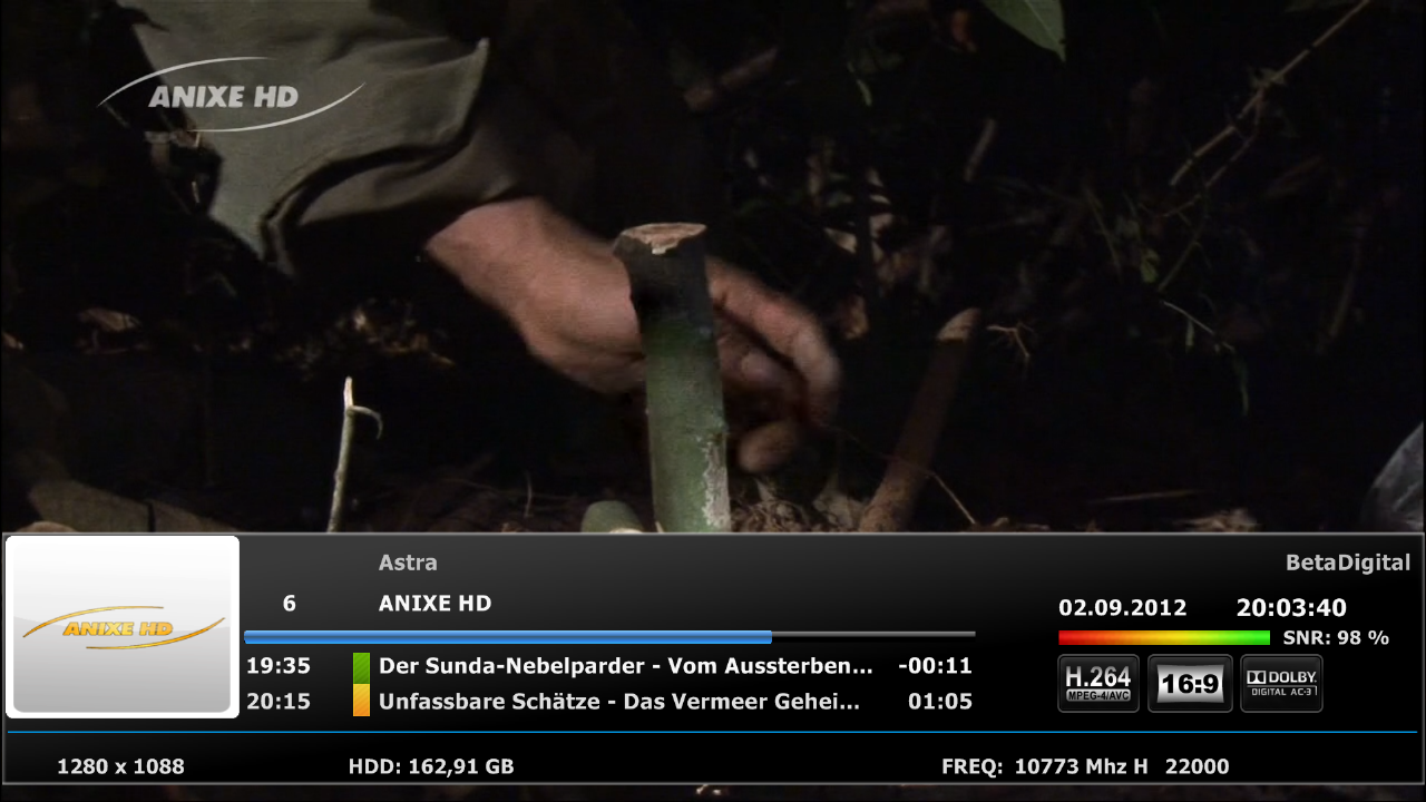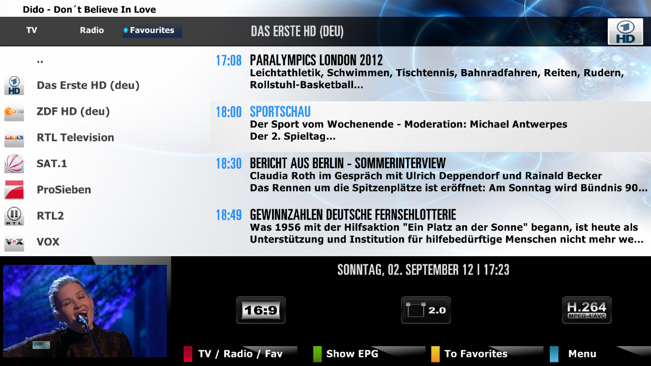 hoto44 Posted September 4, 2012 Author Posted September 4, 2012 (edited) ...da müsstest Du bitte mal Deine Einstellungen entweder im DVBViewer oder an Deinem TV überprüfen. Der Skin ist in 1920x1080 erstellt und wird an meinem Gerät korrekt angezeigt (siehe angehängtem Screenshot). hoto44 Edited September 4, 2012 by hoto44 Quote