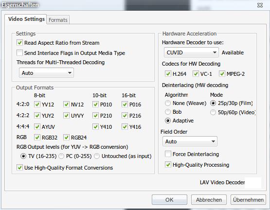 leoniev Posted June 15, 2012 Posted June 15, 2012 Hallo alle zusammen, ich bin neu hier und hoffe, dass ihr mir weiterhelfen könnt? Ich habe ein kleines Problem mit dem LAV CUVID Filter unter Win XP mit dem DVBViewer (DVB-S(2)). Auf der Homepage des Herstellers steht als Hinweis für XP-User "Use DXVA Interop Mode” : setting off. Leider finde ich beim besten Willen diese Option nicht unter den Einstellungen des Filters... Graka ist ne Geforce 8400 GT. Ich möchte die Einstellung ändern, da ich ARD HD seit der Umstellung auf die neue Frequenz einfach nicht ruckelfrei angezeigt bekomme. Alle anderen HD Sender und auch HD Videos laufen problemlos. Kann mir jemand sagen, wo ich diese Einstellung ändern kann? Ich hoffe ihr könnt mir weiterhelfen, bin langsam am verzweifeln Quote