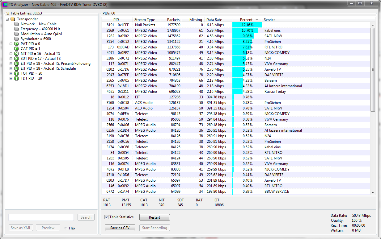 Derrick Posted June 16, 2012 Posted June 16, 2012 Eben habe ich mir mal Transedit geladen und darin mal eine Sixx Aufnahme analysiert die ich damit gemacht habe. Für eine systematische fehlersuche solltest du zunächst mit transedit den live stream analysieren. Und zwar für verschiedene transponder (wenn möglich mit unterschiedlicher modulation -> 64QAM und 256QAM) und für jede karte einzeln. Zunächst mit deiner anordnung so wie sie ist und dann für eine karte alleine ohne splitter etc., also mit einem (möglichst kurzem) kabel direkt von der anschlussdose. Gibt es dabei keine signifikanten unterschiede, kannst du noch checken, ob z.b. usb3 controller am pcie bus hängen, die die übertragung beeinflussen können. Die kannst du zum test mal deaktivieren. Quote
