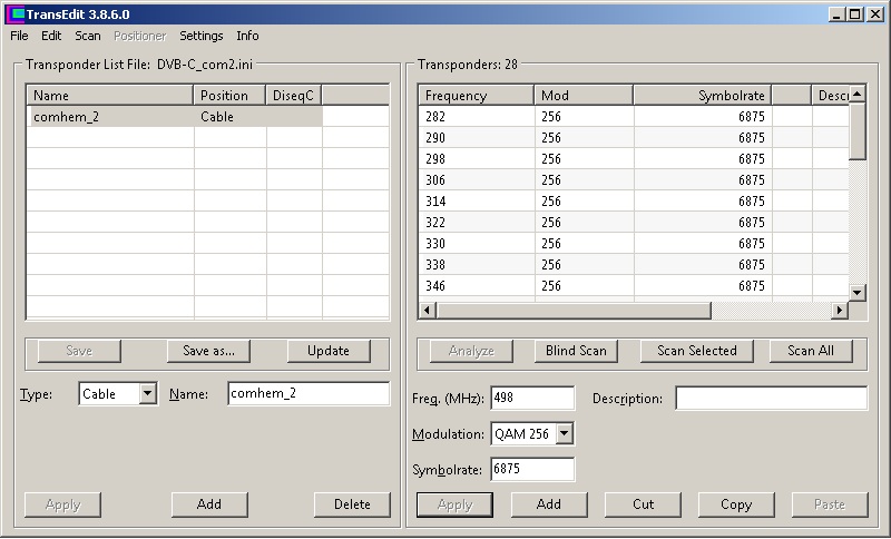 senz Posted August 26, 2012 Author Posted August 26, 2012 (edited) Use TransEdit for editing the transponder list http://www.DVBViewer.com/griga/TransEdit%20E/Content.html Well, I've opened the transponderlist in Transedit and it seems Ok. Look att printscreen below. Edited August 26, 2012 by senz Quote