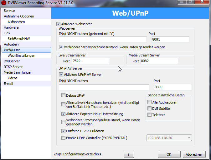 Krejci Posted November 1, 2012 Posted November 1, 2012 (edited) Hi Leute, versuche seit 2 Tagen irgendwie übers Internet auf mein Webinterface zuzugreifen. Das Streamen innerhalb meines Heimnetzwerkes funktioniert 1A. Notebook & iPhone alles läuft. Nur von außen, komme ich nicht drauf. Habe am HTPC schon die Firewall deaktiviert und in der Fritz!Box jede Menge Ports geöffnet. Aber es klappt nicht! Habe mal einige Bilder von meinen Einstellungen angehängt, vl. findet ja jemand einen Fehler, oder kann mir einen Tipp geben. Ich weiß nicht, ob ich etwas übersehn habe, oder ob ich einfach irgendwas überlesen habe...ich bin am Verzweifeln... Gruß, Krejci Edited November 1, 2012 by Krejci