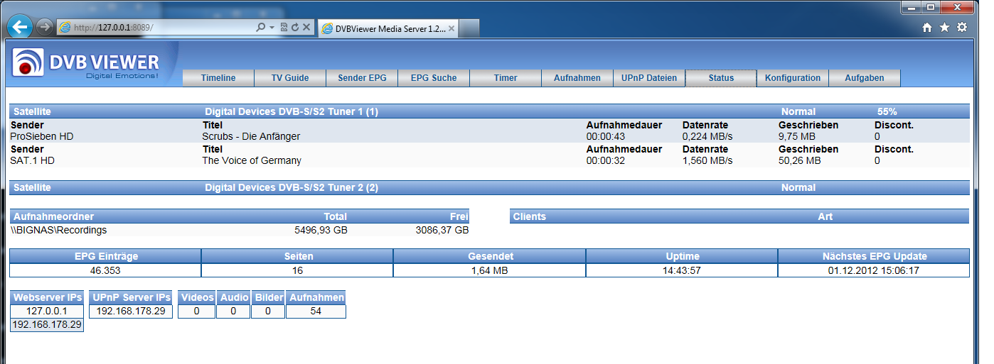 tih Posted November 30, 2012 Author Posted November 30, 2012 1) Die Timer sollten im Webinterface Rot eingefärbt sein wenn sie wahrscheinlich nicht aufgenommen werden können. 2) Dann ist der DVBViewer wahrscheinlich nicht richtig konfiguriert (Echte Hardware auf nicht Verwenden setzen usw.). http://de.DVBViewer.tv/wiki/Recording_Service_Installationsanleitung 1) Ja, das stimmt, habe ich jetzt auch bemerkt, dort wird etwas rot eingefärbt. Wenn ich mehrere aktuell laufende Sendungen zur Aufnahme programmiere, wird allerding auch manchmal etwas rot, das aktuell aufgenommen wird... 2) Die Anleitung habe ich genau befolgt. Vor allem wie geschrieben, die echte Hardware auf "nicht verwenden" gesetzt. Vielleicht (bis wahrscheinlich) haben die Probleme auch etwas mit der "Transponderbündelung" zu tun. tih