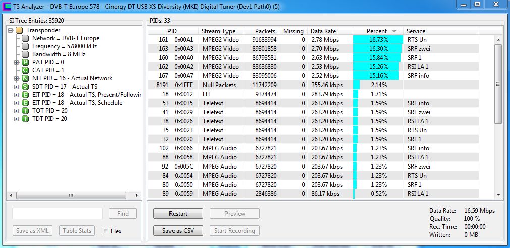 CiNcH Posted December 31, 2012 Posted December 31, 2012 Ich wohne hier im DVB-T Randgebiet in Österreich. ORS sagt, Empfang wäre nur über eine Dachantenne möglich: Mit einem Diversity Antennen Setup habe ich eigentlich hervorragenden Empfang. Die ORS Muxe werden vom Sender Pfänder mit einer ERP von 60-70 kW abgestrahlt. Das Signal ist fehlerfrei. Hier ein Screenshot von den TerraTec Home Cinema Signal Statistiken: Der SRG Mux wird lediglich mit einer ERP von 9 kW abgestrahlt. Da gehen gelegentlich ein paar Pakete flöten. Hier die entsprechende Signalstatistik: Der Prozentbalken für die Signalstärke ist offensichtlich falsch. Weiß jemand, was der Wert bei der Signalstärke zu bedeuten hat (L1 P1)? Ich möchte das Signal nun etwas optimieren, weiß aber noch nicht, wo ich ansetzen soll, weil ich die Signalstärke nicht zu interpretieren weiß, sprich ob ein Verstärker Sinn machen könnte oder nicht. Quote