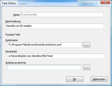 Um einen automatischen Standby nach Aufnahmen zu verhindern, wenn andere Programme (z. B. XBMC) aktiv sind, habe ich mir ganz schlau ausgedacht ( ;) ) diese Information dem EventGhost per -e Event zukommen zu lassen. Also ganz flink eine Aufgabe gebastelt, die diesen Aufruf wie im anhängenden Screenshot durchführen soll (ich habe es mit und ohne Anführungszeichen versucht)... leider schaffe ich es nicht, dass diese Aufgabe auch ausgeführt wird.