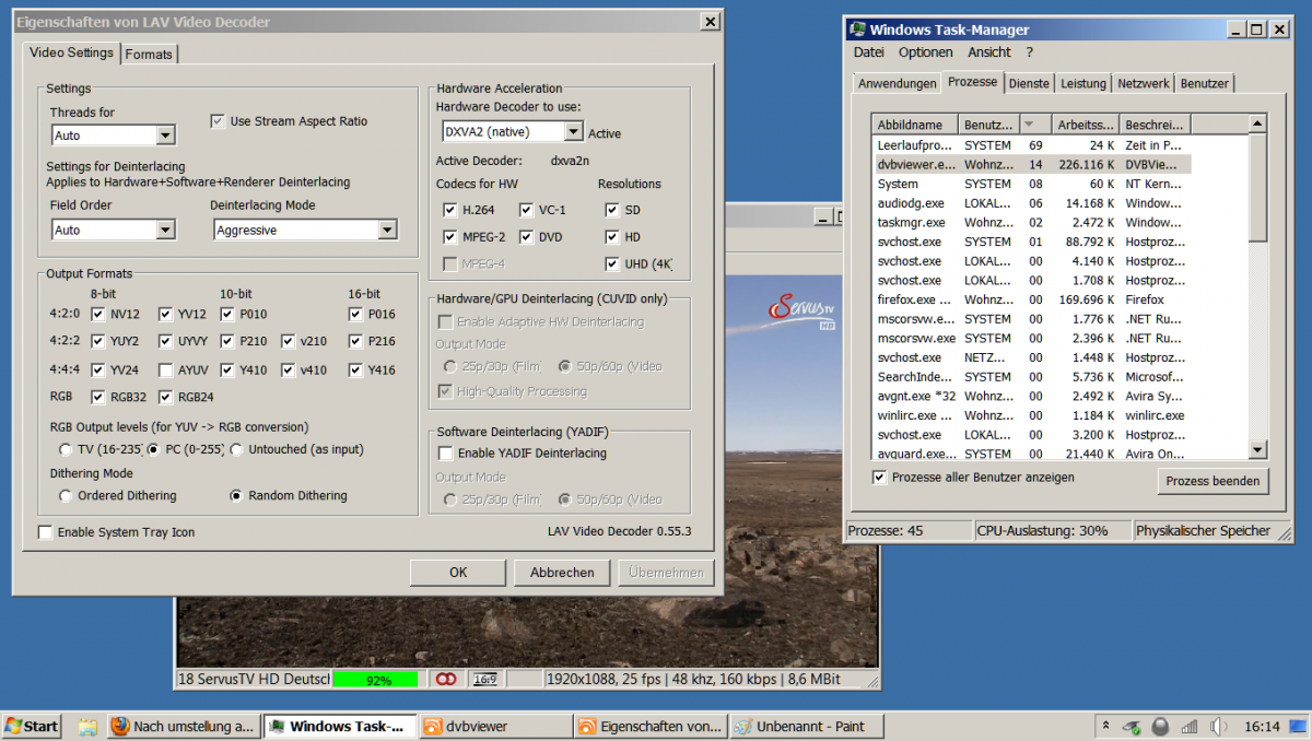 chris2k3 Posted March 30, 2013 Author Posted March 30, 2013 wenn es nicht an der Technisat liegt, dann wuerde ich mal ueber ein upgrade auf einen HD5570 nachdenken. Versuchs mal ohne Aero und evtl. ohne EVR. HD5570: Nein, unter XP gehts ja auch. Daran kanns glaub ich nicht liegen, sonst würds unter XP ja auch zicken Aero: Ist aus, siehe Screen EVR: Hab schon alle Render durch, immer mit dem selben Ergebnis Die Technisat werd ich wohl als nächstes mal tauschen und dann testen. Verstehe zwar auch nicht, warum sich das so auf die CPU Last auswirken soll, aber was bleibt mir anderes übrig... Quote