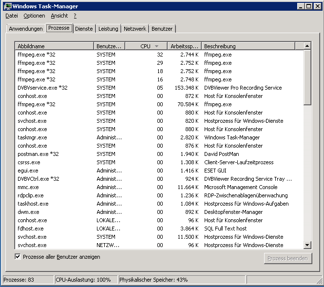 bigp4 Posted May 13, 2013 Posted May 13, 2013 Hallo, seit RS 1.26 habe ich das Problem das ffmpeg32.exe 4x im Tastmanager steht und den Server zu 100% auslastet. Habe mal ein Screenshot davon erstellt. Einer eine Idee? RS läuft auf 2008R2