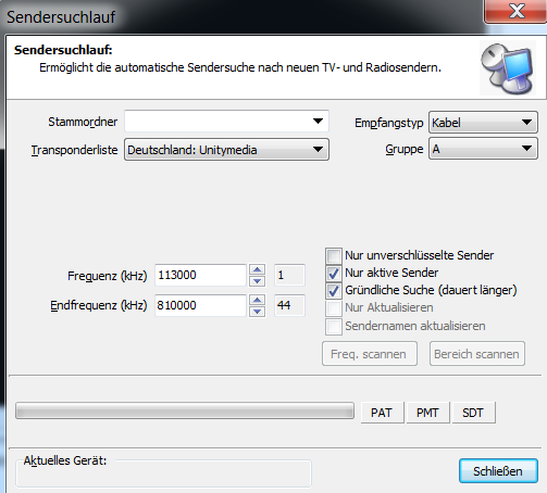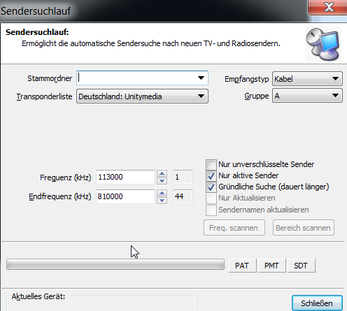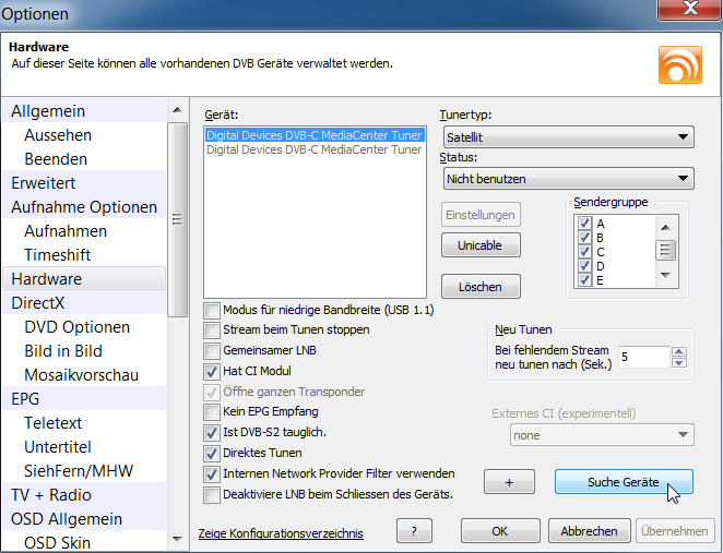 Max281 Posted May 26, 2013 Author Posted May 26, 2013 Ich habe nun in der DVBCineConfig für beide Tuner DVB-C aktiviert und DVB-C WMG deaktiviert. Anschließend habe ich den Button "suche Geräte" in den Hardware Optionen des DVB Viewers gedrückt. Geändert hat sich leider nichts. Außerdem habe ich versucht einen Stammordner zu benennen. Aber wie geht das? Ich habe nicht die Möglichkeit den Rechner über einen Button zu durchsuchen. Auch wenn ich eine konkrete Ordneradresse z.B. C:\Program Files (x86)\###### pflege ändert sich nichts. Ich kann weiterhin den Bereich nicht scannen. Screenshots hängen an. Quote