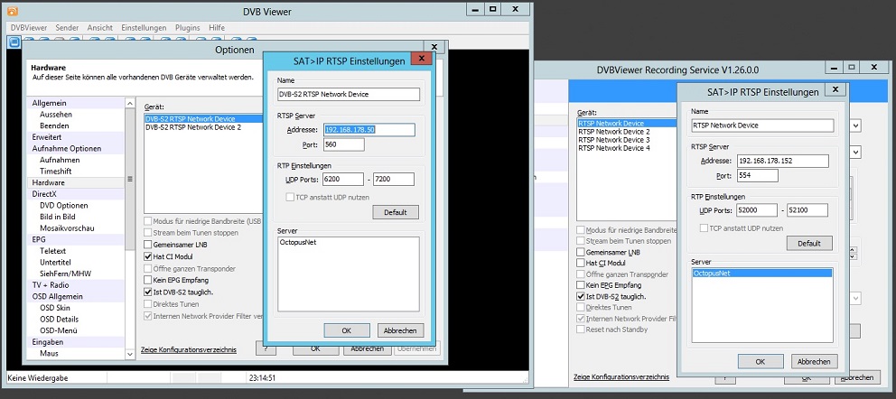 Boogie2005 Posted June 9, 2013 Author Posted June 9, 2013 Also ich habe nun mal im RS auf dem Server die RTSP gelöscht, dann auf Geräte suchen geklickt. Da wurden sie wieder gefunden. Und sofort begann eine geplante Aufnahme. Aber dann zurück auf den Client, dort dann DVBViewer gestartet, und unter Optionen wie im Bild den RTSP Tuner wieder gewählt. DVBViewer beendet, und neu gestartet. Nix mit Live-TV!! Erst wenn ich auf dem Bild den unteren Tuner, OctopusNet wähle, kann ich wieder TV sehen!! Was mache ich falsch??? Boogie Quote