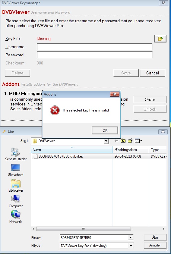 KennethDK Posted June 25, 2013 Posted June 25, 2013 (edited) hello. i have some problems with my keyfile when i try to install DVBViewer 5.1, it's worked on my old Windows 7 64 bit version, but have some problems, so i re-installed from scrats Windows 7 64 bit, but now when i ise keymanager7keytool it's says my keyfile is invalid, it's anybody know what i could do, i have alao tried to download the key file from my mail and the keyfile have the right file extension, så i not now what's wrong. Edited June 25, 2013 by KennethDK Quote