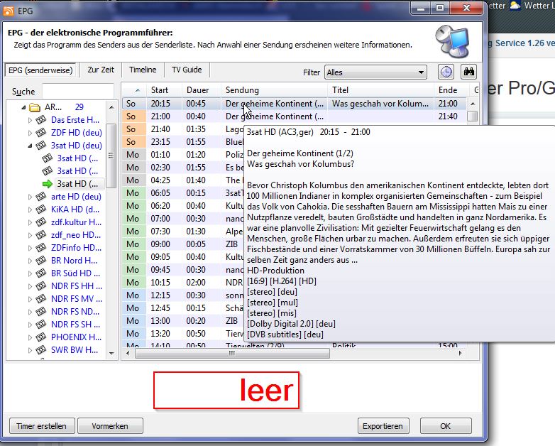 steppe Posted September 22, 2013 Posted September 22, 2013 Hallo, seit einigen Wochen wird im EPG-Fenster unten keine Information mehr zur Sendung angezeigt. Mouseover funktioniert, wie man im Screenshot sieht. Wäre für einen Tip sehr dankbar. Gruß Steppe Quote
