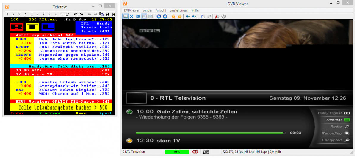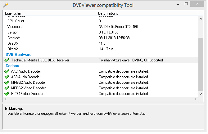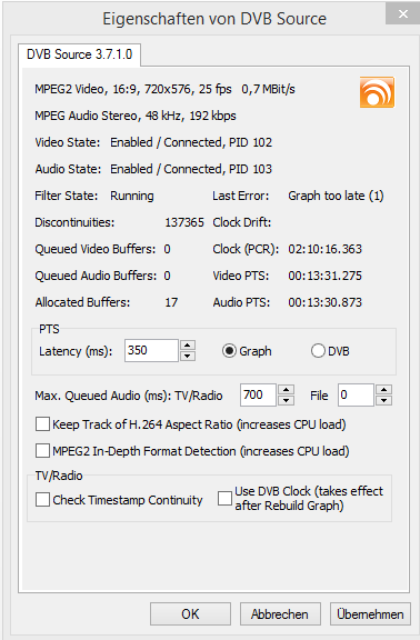 MasterRalf Posted November 9, 2013 Posted November 9, 2013 Hallo zusammen, was kann da bei mir los sein? Ich habe im Foum zwar ähnlich Fälle gefunden aber nicht genau die gleiche Fehlersituation. Habe die aktuelle Version 5.2.8.1 unter Win8.1 installiert. Habe Kabelanschluss von Kabel BW an meiner Technisat CableStar HD 2 TV Karte, Treiberversion 1.3. Grafikkarte ist eine Nvidia Geforce GTX 460 von Gigabyte: GV-N460OC-1GI. Das Mainbaord ist das MSI ZH77A-G43. Alle Sender werden einwandfrei vom Suchlauf gefunden. Sender wie ZDF HD oder Eurosport funktionieren einwandfrei. Aber bei allen Programmen die im Frquenzumfeld von RTL bis Pro7Maxx sind habe ich ein schlechtes bis gar kein Bild, genauso beim Ton und die discontinuities gehen stark nach oben. EPG und Videotext funktioniert allerdings bei diesen Sendern ohne Probleme. DVBViewer Pro zeigt 98% Signalqualität an bei funktionierenden wie auch nicht funktionierenden Sendern. Wenn ich dann an meinem Breitband-Kabel-Dämpfungsregler 0-20dB drehe den ich gekauft habe weil ich dachte dass das hilft, dann geht die Qualität auch unter auf 50 oder 30% und es wird gar kein Bild und Ton mehr angezeigt. Daher scheint die Signalqualität richtig gemessen zu werden. Codec-mäßig habe ich das Windows 8 Codec Pack 32+64 Bit von Shark007 drauf + die Codecs die mit der TV Karte mitgeliefert wurden: MainConcept DTVDecoderPro. Was ich schon probiert habe und nichts geholfen hat: Einen Breitband-Kabel-Dämpfungsregler 0-20dB gekauft Meine DECT Basisstation vom Strom getrennt Verschiedene Video Codecs unter DirectX in DVBViewer eingestellt Das DVBViewer compatibility Tool laufen lassen, es sieht alles gut aus: Hier die support.zip: support.zip Hoffe es hat jemand eine Idee? Quote