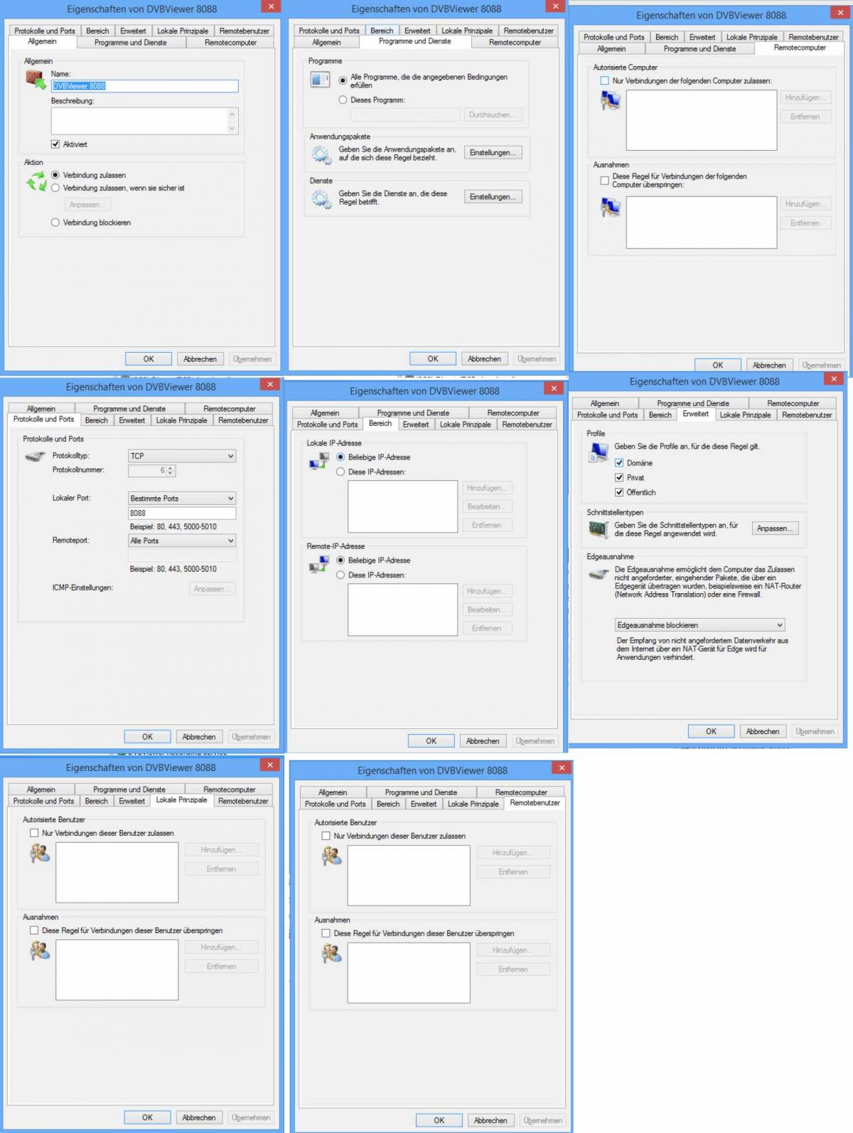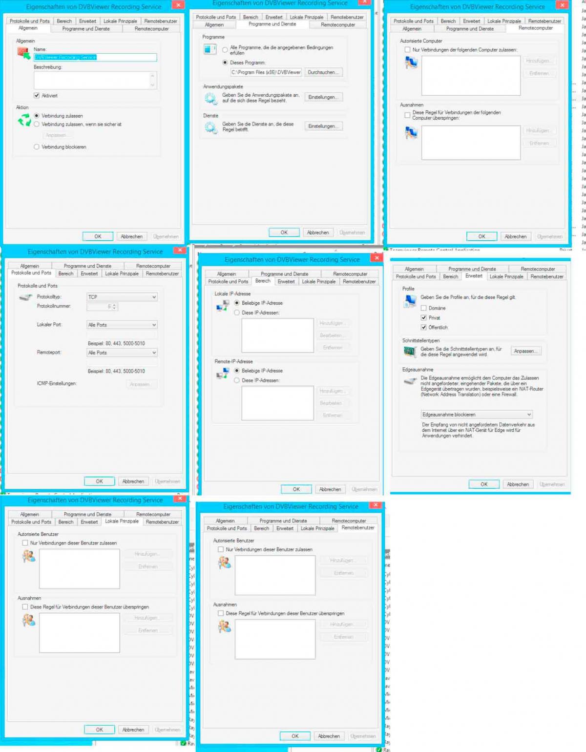Pedder3 Posted November 27, 2013 Author Posted November 27, 2013 Moin, "Du meinst wohl einen DDNS Namen,..." JA "...falls der PC mit dem Recording Service immer die IP 192.168.1.102 im internen LAN hat." JA http://192.168.1.102:8089 von innen ja http://78.94.120.192:8089 von innen ja, von außen nein http://pedder3.no-ip.info:8089 von innen ja, von außen nein (Wenn ich von außen mit no-ip zugreife, steht im Browser auch verbinden mit 78.94.120.192, also an no-ip wird es wohl nicht liegen...) Hab die Firewalleinstellungen geändert (siehe Bild). Leider geht es trotzdem nicht. Es kommt immer die Meldung "Die Webseite kann nicht angezeigt werden". Muss ich noch was bei den "Ausgehenden Regeln" ändern? Hatte die Firewall ja auch mal komplett ausgeschaltet. Auch ohne Erfolg. Komisch, dass die DVBViewer Control APP von außen mit http://pedder3.no-ip.info:8089 funktioniert... mfgPeter