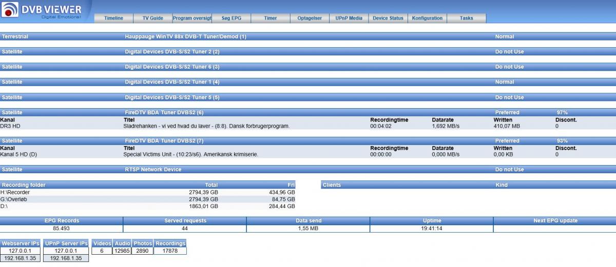krasno Posted December 18, 2013 Posted December 18, 2013 well then you have no problems.. on the other hand, something is wrong somewhere.. Yes it restarts every 60 seconds.. I'm not so clever that I know exactly what this means, but as far as I can see ( or guess) something is wrong here: 15.12.13 15:01:06.189 TRecording ($01FDB1D0) EPG Callback: C More First HD running - 15-12-2013 12:30:00 - 2 Days in New York - 14207 - PDC:0 15.12.13 15:01:06.456 TRecording ($01FDB1D0) EPG Callback: C More First HD not running - 15-12-2013 14:05:00 - Life of Pi - 14208 - PDC:0 15.12.13 15:01:07.121 TBDACIFireDTVModule.InitModule Available 15.12.13 15:02:06.877 TRecording ($01FDB1D0) Tick No data within one minute, restarting! 15.12.13 15:02:06.882 TRecording ($01FDB1D0) H:\Recorder\2013-12-15_15-01-05_C More First HD_Life of Pi - Internationalt eventyrdrama fra 2012 af Ang Lee..ts Discontinuities: 0 - Total size: 55,81 KB - Device:FireDTV BDA Tuner DVBS2 (6) 15.12.13 15:02:07.677 TRecording Release FireDTV BDA Tuner DVBS2 (6) 15.12.13 15:02:07.677 TRecording Destroy FireDTV BDA Tuner DVBS2 (6) 15.12.13 15:02:07.690 TRecording Destroyed FireDTV BDA Tuner DVBS2 (6) 15.12.13 15:02:07.690 TRecording hamDeleted FireDTV BDA Tuner DVBS2 (6) 15.12.13 15:02:07.690 TVCR No shutdown allowed next recording: 15-12-2013 15:10:00