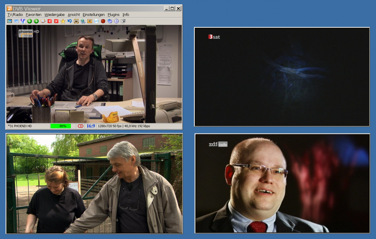 hdv Posted March 19, 2014 Posted March 19, 2014 eine weitere Idee wäre, mal den DVBViewer GE auszuprobieren. Dort hast du ein freies Bild im Bild Fenster. Was die Nutzung und Anordnung der Videofenster vereinfacht. Wenn du nun noch weitere Instanzen installierst dann geht da noch viel mehr. Am besten du machst eine Konfiguration komplett fertig, passt die UserMode.ini an und kopierst dies Dateien dann in die weiteren Instanzen. Auf dem Screenshot ist links eine Instanz (phoenix HD) mit dem Bild im Bild darunter (NDR HD) und rechts eine Instanz (3sat) mit dem Bild im Bild darunter (zdf-info). Zusätzlich habe ich bei dem rechten DVBViewer GE Fenster alle Leisten ausgeblendet so das nur das Videofenster übrig bleibt. Vier mal HD ging jetzt nicht, da eine andere DVB-S2 Karte nicht angeschlossen ist. Auf diese Weise wäre es problemlos möglich mit vier Karten und dann vier Instanzen des DVBViewer GE acht TV-Programm anzuzeigen. Da ja das Bild im Bild auch mindestens immer einen weiteren Sender vom selben Transponder anzeigen kann, welches im Hauptfenster wiedergegeben wird. Eine Zuordnung der Karten/Empfänger zu den Instanzen ist normalerweise nicht nötig. Das macht die Instanzenverwaltung alleine. Dafür aber bitte hier mal aufmerksam lesen. http://www.DVBViewer.com/griga/ besonders wichtig für dich wäre jetzt http://www.DVBViewer.com/griga/Install.html#Mehrbenutzer http://www.DVBViewer.com/griga/Wiedergabe.html#Preview Quote