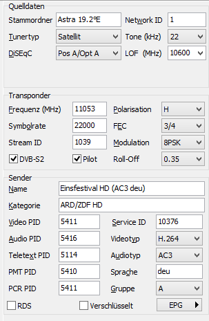 filmfreak Posted January 6, 2014 Posted January 6, 2014 Hallo, ich kann seit der Umstellung die neuen HD-Sender EinsFestival HD, Eins Plus HD nicht empfangen. Der Sendersuchlauf findet die Sender nicht. Ich habe auch schon versucht, die Sender manuell zu konfigurieren (siehe Anhang). Aber auch so funktioniert es leider nicht. Die EPG-Daten werden angezeigt aber der Bildschirm bleibt schwarz, es ist auch kein Ton zu hören. Hat jemand von euch eine Idee was ich hier falsch mache? Anton Quote