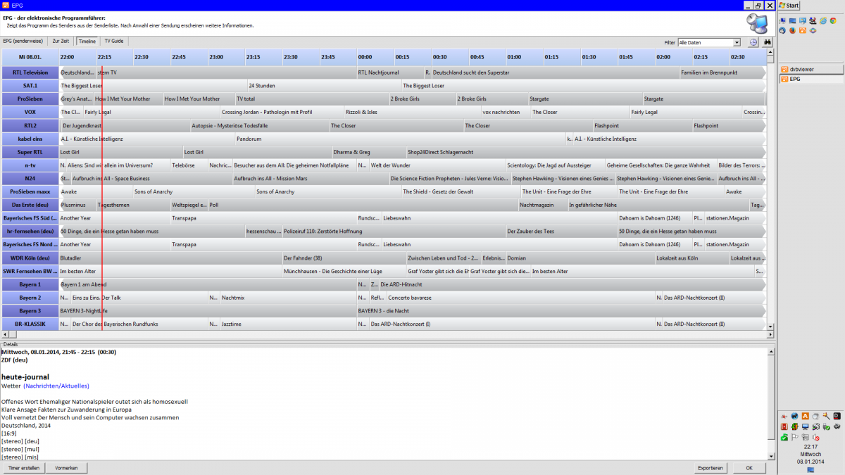 erwin h Posted January 8, 2014 Posted January 8, 2014 Hallo, ich benutze schon länger den DVBViewer, gegenwärtig in der Version 5.2.8.1 Ich hatte bisher eine TV-Karte von Twinhan und habe sie heute gegen eine neue Karte von Digital Devices ausgetauscht. Die Installation und Inbetriebnahme hat gut geklappt. Ich stelle jedoch fest, dass im EPG-Fenster der Button "Filter" fehlt, sodass ich die EPG-Liste (Timeline) nicht in der Reihenfolge der Favoriten sortieren kann. Warum fehlt der Filter-Button und wie kann ich ihn aktivieren? Ich habe im Forum unter "Filter" und "EPG" schon gesucht, aber keinen passenden Treffer gefunden. Kann mir jemand einen Rat geben? TV-Karte: Digital Devices Cine CT V 6 Treiberversion: 2.5.0.80 Mainboard: ASUS P5Q Pro Chipsatz: Intel P 45 Grafikkarte: Sapphire HD 7750 Ultimate Treiber: 13.251.0.0 vom 06.12.2013 Die Support-zip-Datei ist beigefügt. Ebenso ein Bildschirmfoto des EPG-Fensters Dann noch eine Kleinigkeit: Mit dem "Schließ"-Kreuz rechts oben in der Titelleiste kann der DVBViewer geschlossen werden. Ich habe in der Menüleiste/Ansicht den Haken bei "Titelleiste ausblenden" rausgenommen, aber bei jedem Neustart des DVB Viewers ist der Haken wieder drin. Wie kann ich die Titelleiste mit dem Schließkreuz dauerhaft anzeigen? Natürlich kann ich auch mit einem Rechtsklick in das Fenster im aufklappenden Menü auf "Beenden" klicken, aber das ist ein Klick mehr als bisher. Vielen Dank und freundliche Grüße Erwin support.zip Quote