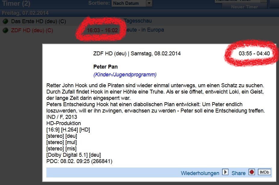 Ho Shi Posted February 7, 2014 Posted February 7, 2014 Ich nutze den DVBViewer Pro nun seit einigen Monaten und bin mit den Funktionen und Aufnahmemöglichkeiten eigentlich rundum zufrieden.Vor wenigen Tagen habe ich mir nun einen neuen PC gekauft und darauf dann ebenfalls wieder DVBViewer Pro sowie den Recording Service installiert.Nun habe ich das Problem, dass ich nicht mehr aufnehmen kann: Der Aufnahmebutton im DVBViewer bleibt nicht "gedrückt". Schaue ich dann im Recording Service nach sehe ich, dass ein Timer mit dem gewünschten Programm und der richtigen Startzeit programmiert ist, die Endezeit allerdings eine Minute DAVOR liegt. Zudem wird für die aufzunehmende Sendung die Programminformation einer Sendung ZWÖLF STUNDEN SPÄTER angezeigt. Irgendwo ist also der Wurm drin...Ich habe auch bereits mehrere Neuinstallationen mit unterschiedlichsten Einstellungen hinter mir. Auch die Installation jeweils einer älteren Version hat keinen Erfolg gebracht. Woran kann dieses Problem liegen?Ich verwende einen PC mit Windows 7 Home Premium 64 bit, eine externe DVB-T und DVB-C USB-Box Anysee E7 TC CI, DVBViewer Version 5.2.9, Recording Service Version 1.28 Beta,Über jede Hilfe wäre ich sehr dankbar! Vielen Dank,Ho Shi Quote