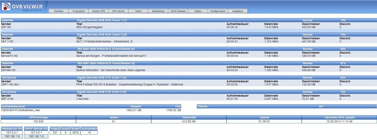 Reiset Posted June 18, 2014 Posted June 18, 2014 (edited) An die Ram habe ich auch schon gedacht. Bei meinem Test werden "nur" 34 % von 4 Giga benutzt (siehe mein Bild oben), dann sollten theoretisch 2 Giga auch genug sein...ausser irgendwas im Hintergrund frisst auch Ram wenn ich auch Sender wechsel, die entschlüsselt werden müssen (SAT1 HD, ProSieben HD etc). Scheinbar muss der Prozessor da ne Ganze menge rechnen ... Ich denke mal, da übernimmt die meiste Arbeit das CAM, oder täusche ich mich da? Allerdings hast du bei dir auch SAT.1 HD in der Liste und offenbar keinerlei Probleme. Wie hast du das Ganze gelöst? Also gerade gleichzeitig bei mir: Aufnahme von RTL 2 HD Aufnahme von SAT 1 HD Live TV mit DVBViewer Pro am Client von RTL 2 HD Probleme gibs keine, CPU LAST am Server zwischen 22-30 % Ich denke, wie schon von Derrick angedeutet, ist das CI-Modul abhängig. Das Problem ist, dass das verwenden von der HD+ Karte in einem anderen CI-Modul als die von HD+ erlaubten CI+-Module nicht "legal"ist ...oder besser gesagt es gegen derer Regeln verstößt. Und CI+ Modulen funktionieren nicht am PC Aus diesem Grund, sollte die Diskussion in diesem Forum nicht zuviel ins Detail gehen Aber es gibst sehr gute Foren im Netz mit einiges an Infos dazu. Gruß Reiset Edited June 18, 2014 by Reiset