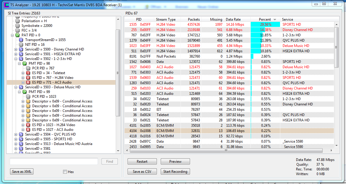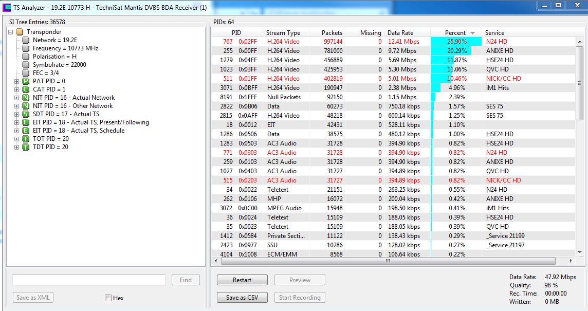 Derrick Posted May 24, 2014 Posted May 24, 2014 Ich habe mit diesem Wert versucht den Sender zu empfangen 4=10773,H,22000,34,S2,8PSK gibt es evtl. einen Transponder auf Asta, mit dem ich meine Empfangsqualität prüfen kann? Welcher schwächer sendet... Vielleicht liegt es ja doch am Empfang oder an der falschen Ausrichtung der Schüssel... Transedit kann ich dir auch nur empfehlen. Wenn du 10773H wählst und auf analyse klickst, sollte es so aussehen und bei missing packets sollte überall 0 stehen. Oben schreibst du, dass du 10803H scannen kannst. Der transponder hat zwar die gleichen parameter bis auf roll-off, aber zumindest bei mir kommt der um einiges besser rein als 10773H. Zum teil wird es am kleineren roll-off liegen (für spezialisten ) Quote