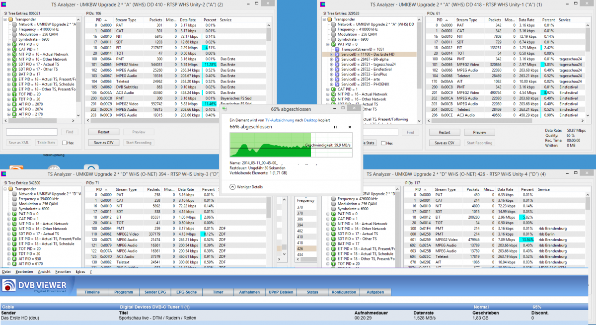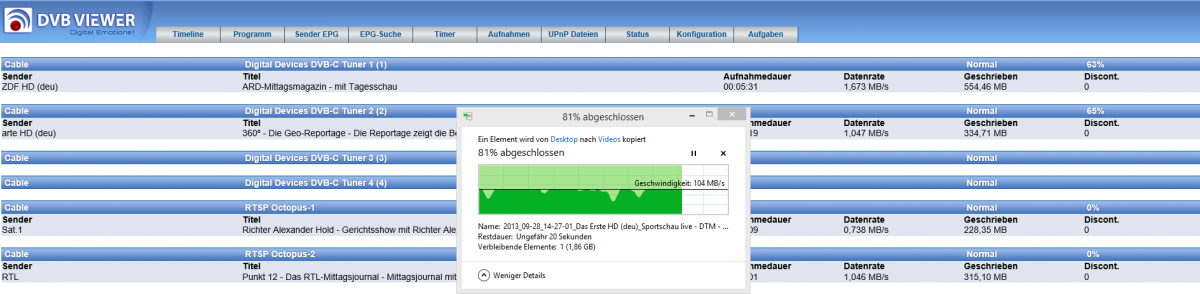 MaxB Posted June 1, 2014 Posted June 1, 2014 (edited) hmm, ich habe hier auch mal folgenden Belastungstest des RS 1.29 durchgeführt: 1.) TransEdit analysiert 4 TS mit QAM 256 (~ 200MBit Netzwerklast, 2 Tuner intern im Server, 2 Tuner sind von der O-NET DVB-C) 2.) der Client kopiert sich parallel einen Film aus dem Aufnahmeverzeichnis des RS (~ 60MBit Netzwerklast) 3.) der RS nimmt währenddessen von Das Erste HD die Sendung "Sportschau live - DTM / Rudern / Reiten" auf 4.) der Intel RAID-Controller vom Server prüft gerade das RAID-System auf Fehler => keine Diskontinuitäten bei der Aufnahme... Mehr fiel mir für das gepostete Problem gerade nicht ein , ich könnte auch noch schnell ein paar Client-PC's anwerfen und dort zappen, aber das war ja nicht als Voraussetzung erwähnt... Edit/Nachtrag: Screenshot zugefügt Edited June 1, 2014 by MaxB