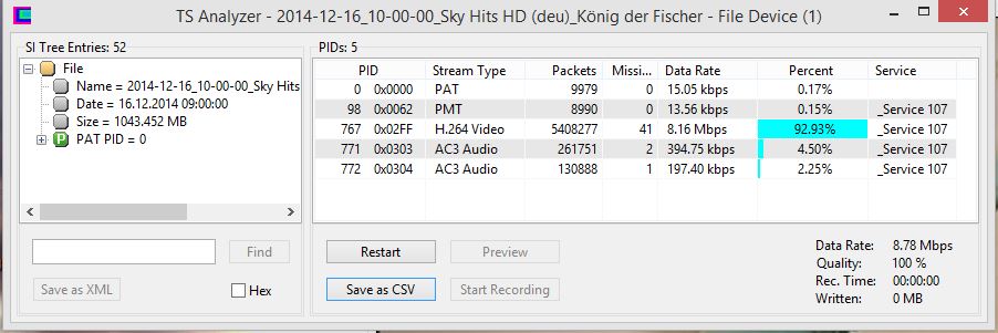 Klaus-Werner Posted December 4, 2014 Author Posted December 4, 2014 Sodele Aufnahme beendet. DVBViewer meldet fehlerfrei. TSDoctor meldet: Starting at packet 0019CB24 PCR: 00:05:20.867 (05:17:56.967)ES ERROR : For PID 0304 01:10:33.056 AC3 packet 0001E0EE has AC3 Crc errorES ERROR : For PID 0303 01:10:33.024 AC3 packet 0001E0F2 has AC3 Crc errorPES ERROR : For PID 02FF 01:14:01.676 PES packet 000301A9 is invalid (PSCPrefix,StreamType,MarkerBit1PTS,MarkerBit3PTS,SizeMismatch), starting with TS packet 00E71080 Size: 248 should be 56242PES ERROR : For PID 02FF 02:01:53.211 PES packet 000301B9 is invalid (PSCPrefix,StreamType,Scrambled,MarkerBit1PTS,MarkerBit3PTS,SizeMismatch), starting with TS packet 00E71501 Size: 84 should be 50105PTS wrap > (33 bit) at packet 00E71663 on PID 0304 detected!PTS wrap > (32 bit) at packet 00E716B6 on PID 0303 detected!Cutting the end at packet 01CB41BA PCR: 02:16:51.883 (07:34:48.850)PES WARNING: For PID 02FF DVB/ATSC unconform PES formating detected: PSCPrefix,StreamType,Scrambled,ControlBitsHd,ControlBitsPTS,MarkerBit1PTS,MarkerBit2PTS,MarkerBit3PTS,ControlBitsPTS2,MarkerBit1PTS2,MarkerBit2PTS2,MarkerBit3PTS2,ControlBitsDTS,MarkerBit1DTS,MarkerBit2DTS,MarkerBit3DTS,SizeMismatchPES WARNING: For PID 0303 DVB/ATSC unconform PES formating detected: PSCPrefix,StreamType,Scrambled,ControlBitsHd,ControlBitsPTS2,MarkerBit1PTS2,MarkerBit2PTS2,MarkerBit3PTS2,ControlBitsDTS,MarkerBit2DTS,MarkerBit3DTS,SizeMismatchPES WARNING: For PID 0304 DVB/ATSC unconform PES formating detected: PSCPrefix,StreamType,Scrambled,ControlBitsHd,ControlBitsPTS,MarkerBit1PTS,MarkerBit2PTS,MarkerBit3PTS,ControlBitsPTS2,MarkerBit1PTS2,MarkerBit2PTS2,MarkerBit3PTS2,ControlBitsDTS,SizeMismatch Anbei entsprechende Log-Files. Gruß Klaus-Werner 12-04_15-10-00_Sky Star Wars HD (deu)_Star Wars Episode II - Angriff der Klonkrieger.log 12-04_15-10-00_Sky Star Wars HD (deu)_Star Wars Episode II - Angriff der Klonkrieger_fixed.log 12-04_15-10-00_Sky Star Wars HD (deu)_Star Wars Episode II - Angriff der Klonkrieger_fixed_problem.txt support.zip Quote