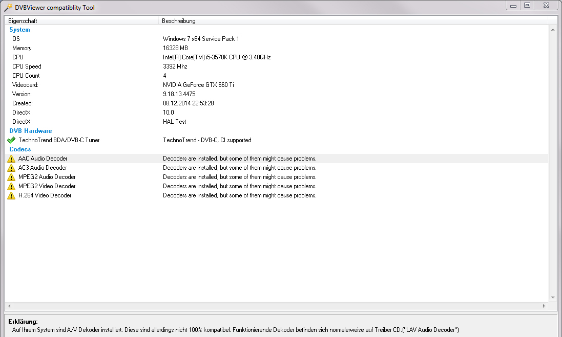 traineee Posted December 8, 2014 Posted December 8, 2014 Hallo Forum, ich habe Probleme mit meiner TV-Karte Technotrend C-1501. Es gibt häufig Bild- und Tonaussetzer. Der Empfang liegt bei den meisten Sendern bei nur 15-22%. Das Compability Check Tool zeigt mir folgende Meldung: 'Decoders are installed, but some of them might cause problems. Auf Ihrem System sind A/V Dekoder installiert. Diese sind allerdings nicht 100% kompatibel. Funktionierende Dekoder befinden sich normalerweise auf der Treiber-CD.' Beim DVBViewer habe ich soweit alles mögliche und aktuelle installiert, von den Technotrend-Treibern auch. Könnte es daran liegen, dass die Treiber für die TV-Karte mit fast sechs Jahren Alter nicht mehr mit Windows7 klarkommen? Würde mich freuen, wenn Ihr mir helfen oder vielleicht auf einen Beitrag verweisen könntet, der mir weiterhilft. Habe leider bisher nichts finden können. Mit besten Grüßen! TV-Karte: Technotrend budget C-1501, TT-budget BDA-driver 5.0.1.8 (16.01.09) Prozessor: Intel i5-3570K, 3,4GHz, Ram: 16 GB Grafikkarte: NVIDIA GeForce GTX 660 Ti, Treiberversion 9.18.13.4475 Mainboard: MSI Z77A-G41 System: Windows 7, 64 Bit support.zip Quote