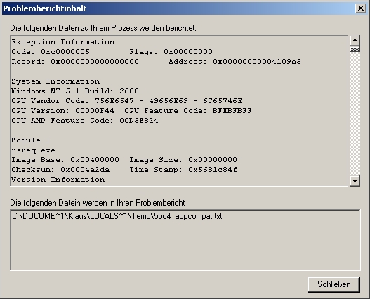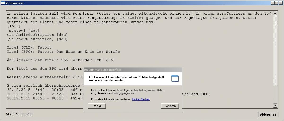 HacMat Posted January 2, 2016 Author Posted January 2, 2016 Hallo Klaus,mir ist es bisher nicht gelungen den Fehler zu reproduzieren. Die neue RS Version (1.32) habe ich mittlerweile installiert und der Requester funktioniert bei mir auch mit dieser Version absolut stabil.Um den Fehler zu finden brauch ich deshalb Deine Hilfe:Klicke doch bitte mal auf das „klicken Sie hier“, um weitere Informationen zu dem Fehler anzeigen zu lassen. Dort sollte der Ausnahmecode (vermutlich c0000005), der Ausnahmeoffsetund der Fehlermodulname (vermutlich rsreq.exe) angezeigt werden. Vielleicht musst Du auch den Debug-Button drücken um diese Informationen abzurufen. Für XP weiß ich das nicht mehr so genau.Du solltest das möglichst bald machen, bevor die Fehlermeldung möglicherweise nicht mehr erscheint, weil die Auftrittsbedingung nicht mehr erfüllt ist.Ich brauche dann noch die endgültig von Dir zugewiesenen Werte folgender Parameter:SearchTimerDBsearchTimerDBmaxDevsearchTimerDBmaxNumOfHitssearchTimerDBcheckDeactivatedTimerssearchTimerDBcheckFoldersearchTimerDBcheckChannelsearchTimerDBcheckEventsearchTimerDBButtonIgnoreVielen Dank und ein frohes neues Jahr!HacMat Quote