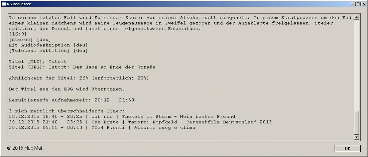 HacMat Posted December 29, 2015 Author Posted December 29, 2015 Neue Version: RS Requester 1.0.6.0ich habe jetzt den RS Requesters, in der Version 1.0.6.0 fertiggestellt.Diese Version stellt am 1. März 16 ihren Dienst ein. Bis dahin werde ich eine weitere Version herausgeben, die wieder mindestens 6 Monate lauffähig ist.Folgende Ergänzungen, Änderungen und Fehlerbereinigungen habe ich vorgenommen:Behobene Fehler:Das Beenden des RS-Requester über das Schließen-Kreutz, Alt-F4 oder Schließen im System-Menü führte zum Absturz des Requesters, wenn das Senden von Requests an den RS noch nicht abgeschlossen war.Änderungen:Der Default-Wert von maxStartTimeDiff wurde von 60 auf 20 reduziert.Die Muster-Konfigurationsdatei wurde um die neuen Schlüssel erweitert.Neue Funktionen: Paramter '-TimerName'Mit 'TimerName' kann man jetzt den Namen des Timers frei zu wählen. Der Timer-Name wird im Datei-Namensschema durch '%name' repräsentiert. Dadurch ist es möglich den Datei-Namen der Aufnahme völlig frei zu gestalten. Das war vorher nur durch Herabsetzen der erforderlichen Mindest-Ähnlichkeit des übergebenen Titels mit dem EPG-Titel möglich, was dazu führt, dass Fehler in den Programmdaten von TV-Browser, TV-Genial und Clickfinder, weniger zuverlässig erkannt werden. Wer also bisher den Titel stark veränderte um den Dateinamen mit Meta-Daten zur Sendung zu ergänzen, kann jetzt den Wert von 'minTitleSim' (Vorgabe: 20) wieder hoch setzen, wenn er die Metadaten mit Hilfe des Parameters 'timerName' übergibt und den mit 'title' übergebenen Titel unverändert lässt. Button 'ignorieren'Der RS Requester lässt sich jetzt so Konfigurieren, dass er bei den „Ereignissen“ 'Eine Aufnahme der Sendung ist bereits vorhanden' und 'Ein Timer für die Sendung existiert bereits', einen Button mit der Beschriftung 'ignorieren' anzeigt, um das Setzen eines Timers zu erzwingen. Konfigurationsdatei: neue Sektion [finalization]Die Schlüssel in der Sektion '[finalization]' werden immer als letztes eingelesen.Hier können Schlüssel-Wert-Zuweisungen stehen, bei denen man sicher gehen will, dass Sie endgültig sind und nicht mehr innerhalb einer anderen Sektion überschrieben werden.Sie ist vor allem dafür gedacht, mit Schlüsseln experimentieren zu können, ohne dass dafür Änderungen in den anderen Sektionen vorgenommen werden müssen. Suche nach bereits vorhandenen Timern, die als Aufnahmeziel die gleiche Sendung haben.Die Suche funktioniert über Sendergrenzen hinweg und ist unabhängig vom Sendetermin.Dazu ein Beispiel:Die Sendung „Tatort: Fegefeuer“ hat folgende Sendetermine:3. Januar 16 21:45 | Einsfestival8. Januar 16 23:40 | Das ErsteHat man bereits einen Timer für die Sendung „Tatort: Fegefeuer“ angelegt, und ist der RS Requester entsprechend konfiguriert, wird bei dem Versuch einen weiteren Timer für diese Sendung zu erstellen, die Fehlermeldung ausgegeben, dass die Aufnahme der Sendung bereits von einem anderen Timer abgedeckt wird. Wenn man möchte kann, man den Requester so einrichten, dass in diesem Fall ein Button mit der Beschriftung 'ignorieren' erscheint mit dem sich der Timer dennoch setzen lässt. Klickt man auf den Button 'abbrechen' wird kein Timer gesetzt.Es gibt sehr viele neue Parameter mit der man diese Funktion an seine eignenen Bedürfnisse anpassen kann. Näheres zu den neuen Parameter findet man im Manual und in der Muster-Konfigurationsdatei.Wer die suche nach vorhandenen Timern einfach nur mal ausprobieren möchte, kann sich die folgenden Zeilen in seine Konfigurationsdatei kopieren:[finalization]SearchTimerDB = 65searchTimerDBmaxDev = 10searchTimerDBmaxNumOfHits = 3searchTimerDBcheckDeactivatedTimers = disabledsearchTimerDBcheckFolder = disabledsearchTimerDBcheckChannel = disabledsearchTimerDBcheckEvent = enabledsearchTimerDBButtonIgnore = enabledsetReturnCode = 48,1Das sind sämtliche Parameter , die die Suche konfigurieren. Zum Teil werden den Parametern nur die Default-Werte nochmals zugewiesen, was eigentlich unnötig ist, es erleichtert aber das Experimentieren, wenn die Schlüssel bereits in der Konfigurationsdatei vorhanden sind.Mit 'setReturnCode = 48,1' weist man den Requester an, einen Fehlercode zurückzugeben, wenn ein Timer gefunden wurde oder eine Aufnahme der Sendung bereits existiert. Standardmäßig tut er das nicht. Wird durch das Betätigen des Ignorieren-Buttons das Setzen eines Timers (erfolgreich) erzwungen, wird trotzdem der Fehlercode 0 zurückgeben, sodass die Sendung korrekt im TV-Browser als zur Aufnahme vorgesehen markiert wird.Ich empfehle sehr den Wert von SearchTimerDB einmal runterzusetzen, z.B. auf 30 oder 20 und dabei 'searchTimerDBButtonIgnore' auf 'enabled' zu belassen. Das führt zwar zu vielen „Fehl-Alarmen“ aber der Sinn dieser neuen Funktion wird einem dadurch schneller verständlich.Und den Timer kann man ja durch den erscheinenden Ignorieren-Button dennoch setzen.Wer die ähnlich funktionierende Suche nach bereits vorhandenen Aufnahmen noch nicht kennt, kann die Sektion '[finalization]' noch um diese Zeilen ergänzen:SearchRecDB = 70searchRecDBmaxDev = 10searchRecDBmaxNumOfHits = 3searchRecDBcheckFolder = disabledsearchRecDBcheckChannel = disabledsearchRecDBcheckEvent = enabledsearchRecDBButtonIgnore = enabledAuch hier gilt analog zur Suche nach Timern: Den Wert von SearchRecDB für Testzwecke einmal auf einen ganz niedrigen Wert setzen.Hat man die für sich geeigneste Konfiguration gefunden hat, empfehle ich die obigen Schlüssel in die Sektion '[Request Record]' zu verschieben. Die Sektion '[finalization]' wird Request-Typ unabhängig eingelesen. Die Parameter oben machen aber bei einem „Delete-Request“ keinen Sinn, was beim Löschen eines Timers für jeden der Parameter zu der Ausgabe des Hinweises führt, dass der Parameter ignoriert wurde. Das ist zwar nicht schlimm, da es keinen Einfluss auf die Funktion hat, Perfektionisten könnten sich aber daran stören. Verbesserungen:Ähnlichkeitsprüfung:Überzä