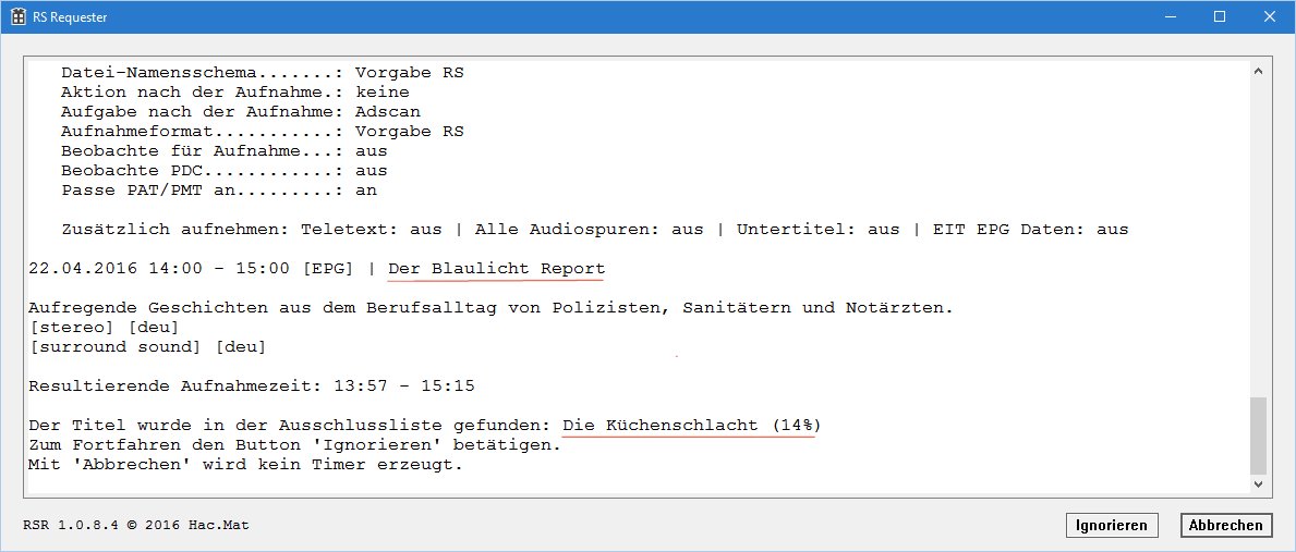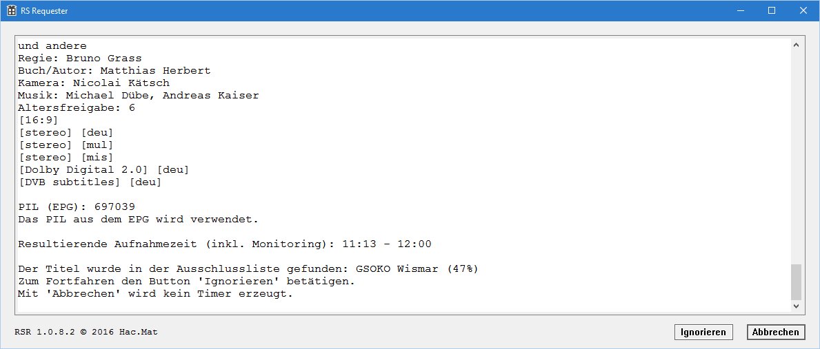 HacMat Posted April 14, 2016 Author Posted April 14, 2016 (edited) Neue Version: RS Requester 1.0.8.1Lauffähig bis 31.10.16 Verbesserungen:Erhöhte Kompatibilität mir älteren Prozessoren:Es ist jetzt kein Prozessor mit SSE2-Befehlssatzerweiterung mehr notwendig.Behobene Fehler:Der Parameter/Schlüssel 'timeout' funktionierte nicht.Neue Funktionen:Ausschlussliste:Es ist jetzt möglich für den Requester eine Ausschlussliste bereitzustellen, die die Titel der Sendungen enthält, die vom Requester zurückgewiesen werden sollen.Dazu wurden folgende Parameter/Schlüssel neu eingeführt (Vorgaben sind unterstrichen):(-)searchExcludingList (=) {off|disabled|0|...|on|enabled| |70|...|100}Das Argument ist die Mindestähnlichkeit, den der Text einer Zeile der Ausschlussliste mit dem Sendungstitel haben muss, damit die Sendung als in der Ausschlussliste enthalten gilt.Da die Zeilen für die Ähnlichkeitsberechnung normalisiert werden, hat die Formatierung der Ausschlussliste keinen Einfluss auf das Suchergebnis. Auch die Groß- und Kleinschreibung bleibt unberücksichtigt.Dadurch lässt sich die Ausschlussliste völlig frei gestalten.Zeilen mit einem Semikolon am Anfang gelten als auskommentiert, werden also nicht berücksichtigt(-)searchExcludingListReadFile (=) DateinameMit 'searchExcludingListReadFile' kann man eine Text-Datei angeben, die die Ausschlussliste enthält.Die Datei muss UTF8-kodiert sein.Wird 'searchExcludingListReadFile' nicht verwendet, wird im Requester-Verzeichnis nach der Datei 'exclude.txt' gesucht.Ist diese nicht vorhanden, wird eine Fehlermeldung ausgegeben.(-) searchExcludingListButtonIgnore (=) {0|off|disabled|1| |on|enabled}Schaltet den Ignorieren-Button ein oder aus, mit dem man bei einem Such-Treffer den Timer dennoch setzen kann. Die Ausschlussliste ist sehr einfach gehalten. Ich kann noch nicht beurteilen, wie Praxis-tauglich sie ist. Ich stehe deshalb Erweiterungsvorschlägen offen gegenüber. Auch wenn diese Version kaum Neuerungen bietet, wäre es hilfreich, wenn möglich viele auf die neue Version umstiegen. Ich habe viele kleinere Bugs beseitigt, die bisher nicht protokolliert waren.Bei der Beseitigung dieser Fehler, können sich aber auch neue Fehler eingeschlichen haben. Deswegen bitte ich Euch, möglichst immer die aktuellste Version einzusetzen und wenn etwas nicht funktioniert oder unverständlich erscheint, es sofort zu melden - das hilft mir bei der Entwicklung sehr. Läuft bei jemanden die neueste Version so instabil, sodass er sie nicht einsetzen möchte, werde ich die ältere Version solange in der Laufzeit verlängern, bis ich die Ursache für die Instabilität beseitigt habe. Noch ein Hinweis zum Problem mit dem sich nicht aktualisierenden Fensters des TV-Browsers, wenn sich der RSR im Ignorieren-Abbrechen-Dialog befindet und das Fenster des RSR verschoben oder in seiner Größe geändert wird:Ich habe festgestellt, dass das Problem bei mir nur bei den Designs 'Windows 7-Basis' und 'Windows klassisch ' auftritt. Bei den anderen Designs wird das Fenster des TV-Browser ordnungsgemäß neu gezeichnet.Möglicherweise verhält es sich mit anderen Grafikkarten/Grafiktreibern wieder anders. Wen dieses rein ästhetische Problem stört, kann es also mal mit einem anderen Windows-Design probieren.Es handelt sich hierbei, nicht um einen Bug des TV-Browsers oder RS-Requesters, sondern möglicherweise nur um ein Feature, welche bei den betreffenden Designs aus Performance-gründen deaktiviert ist.Kritik und Verbesserungsvorschläge sind wie immer willkommen.Viele Grüße,HacMat Download: RS Requester 1.0.8.1.zip Edited April 15, 2016 by HacMat Quote