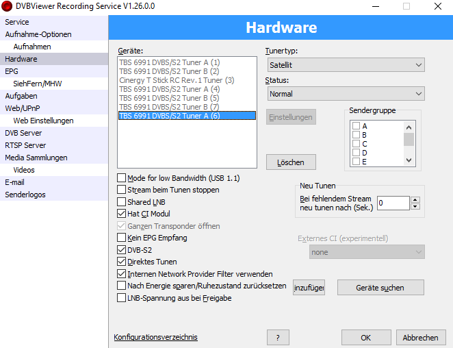 Dulan Posted March 12, 2016 Author Posted March 12, 2016 @Tjod ja die anderen Karten sind so konfiguriert... bzw. mein aktuelle Konfiguration wie im Anhang... bzw. eine neue support.zip wie gesagt wenn die Karte direkt von DVBViewer Pro verwaltet wird kann ich ORF usw. schauen... über den RS kommt kein Bild und kein Ton beim ORF... ServusTV hingegen funktioniert ohne Probleme... @Derrick wie wo was multipd? wie schon im anderen post beschrieben wollte ich mit post #12 von dir wissen wie der tweak funktioniert... #13 wurde von mir NICHT in diesen thread geschrieben sondern in diesen http://www.DVBViewer.tv/forum/topic/57930-sky-und-recording-service/ da post 13 nichts mit dem zu tun hat... aber das hab ich ja vorher schon geschrieben... das post 13 von Tjod hier herverschoben wurde.. was das ganze mit beratungsresistens zu tun haben soll kannst du mir aber gerne erklären... support.zip