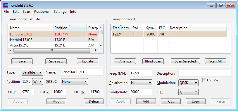Griga Posted July 27, 2015 Posted July 27, 2015 my satellite dishes are facing, 110.0w, 119w, 129w and 97 w(19/Ku) Far out... from the European point of view. For scanning and finding channels you first need a transponder list for each satellite position that you want to receive. Unfortunately I coudn't find ready-made transponder lists for these satellite positions in the web, so it looks like some manual work will be necessary. This is what TransEdit is made for. First create an empty list: File -> New List -> Satellite. Then enter the orbital position and a name on the left side of the TransEdit main window (110 W, EchoStart 10,11). Click Apply on the left side. Then have a look at this site: http://www.lyngsat.com/packages/Dish-USA-110W.html I found it by searching with Google for LyngSat 110. Now you need to successively enter the data for each transponder. Lets start with the first one (12224 R): Enter the LyngSat data for this transponder on the right side of the TransEdit main window 12224 as Frequency H or V as Polarisation (dunno which one corresponds to R, you need to try) 20000 as Symbolrate (SR) 7/8 as FEC Auto or QPSK as modulation (just a guess - most likely correct) and click Add. It should look like this: Now you can try to scan this transponder by clicking Scan Selected. If it works, repeat the procedure for each frequency resp. transponder listed on LyngSat for 110° W. Then create lists for the other satellite positions... That's basically how to start. However, there are open questions, particularly which mechanism is provided by your outdoor equipment for selecting the satellite orbital position - usually it's DiSEqC. Maybe you can tell a bit more about it... 1 Quote