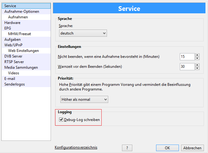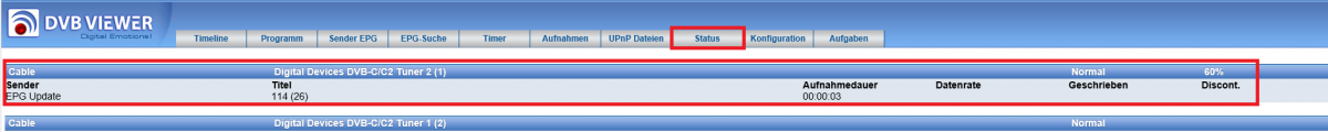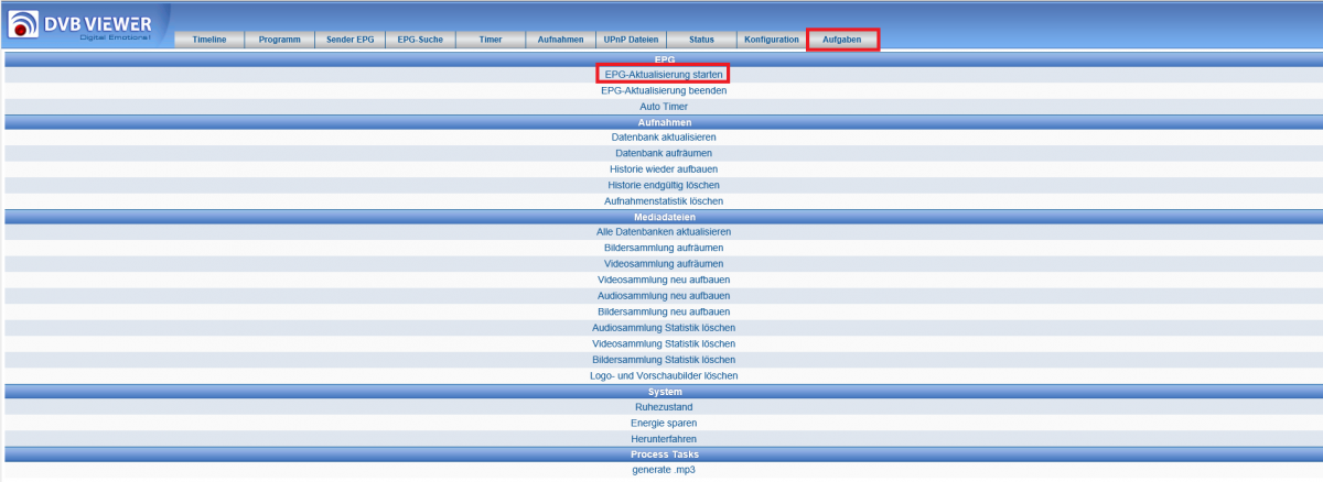 MaxB Posted September 29, 2015 Posted September 29, 2015 So, die Senderliste funktioniert hier auf dem Testsystem einwandfrei, es wurde bis auf die Regionalen für Hessen (Rhein Main TV & Offener Kanal, ich wohne in NRW...) überall EPG-Daten geladen, ich hänge mal das Ergebnis des RS hier an: C-ProgramData-CMUV-DVBViewer-Config-epg.dat.zip Du kannst diese epg.dat ja mal nach "C:\ProgramData\CMUV\DVBViewer\Config\" kopieren (RS vorher bitte stoppen!) bei Dir testen und schauen, ob Du damit auch gültige EPG-Daten im WEB-IF des RS angezeigt bekommst. Falls nicht, kontrolliere bitte Datum/Uhrzeit des PCs! Falls Du damit auch EPG-Daten angezeigt bekommst möchte ich Dich bitten ein sauberes "svcdebug.log" wie folgt zu erstellen: 1.) RS stoppen und danach die vorhandene "svcdebug.log" (im Ordner "C:\ProgramData\CMUV\DVBViewer") löschen. Falls keine vorhanden sein sollte, das Debug-log schreiben im Kontrollpanel des RS aktivieren: 2.) Den RS wieder starten und direkt danach unter "Aufgaben" die EPG-Aktualisierung starten: 3.) Über die Statusseite den Verlauf des EPG-Updater kontrollieren: 4.) Wenn alle 26 Transponder bei Dir gescannt wurden, bitte den RS wieder stoppen, das "svcdebug.log" zippen und hier anhängen.