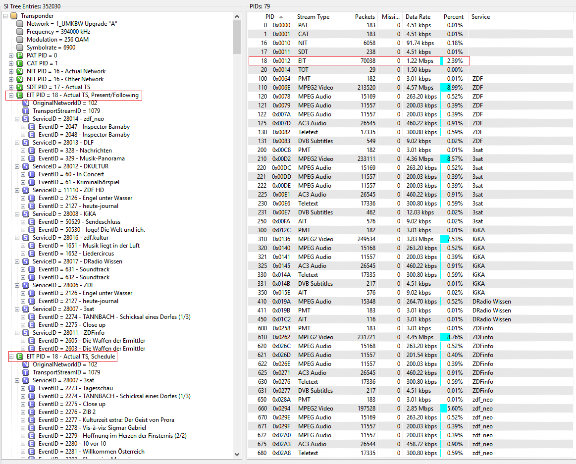 MaxB Posted September 28, 2015 Posted September 28, 2015 Der "weiße Recorder" (ist von Echostar) und die Horizon nutzen beide keinen DVB-EPG sondern eigene Karussell Aps, daher ist der verlinkte Thread nicht für den DVBViewer/RS anwendbar! @chart-man: Wenn Du mit TransEdit einzelne Kanäle analysierst, ist dort die PID 18 vorhanden und werden Dir auf der linken Seite unter "EIT PID = 18 Actual..." Informationen angezeigt? Hier ein Beispiel von dem ZDF-Transponder S32 / QAM 256 /Symbolrate 6900: