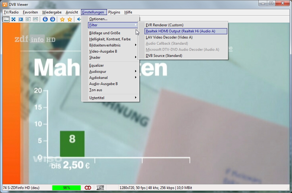 Madtrick Posted October 15, 2015 Author Posted October 15, 2015 Hallo. Danke für eure Antworten und eure ersten Ansätze. Zuerst, den LAV habe ich gestern neu geladen und neu installiert. Es ist die Version 0.66.0. So steht es unten rechts im Einstellungsfenster des Lav-Filters.Ist das die nightly Version? Sollte ich nach dieser Version suchen und sie installieren? Schließlich funktionierte es ja. Und es gab keine Änderung im System. In der Vergangenheit hat das System auch mit dem Microsoft DTV-DVD Video Decoder funktioniert. Also beide hatten funktioniert. Ich habe einmal die Screenshots gemacht. einmal einen SD Sender der DVB-S2 Karte und einmal von einem HD-Sender. Ein imenser Unterschied. Woher kommt das? Quote