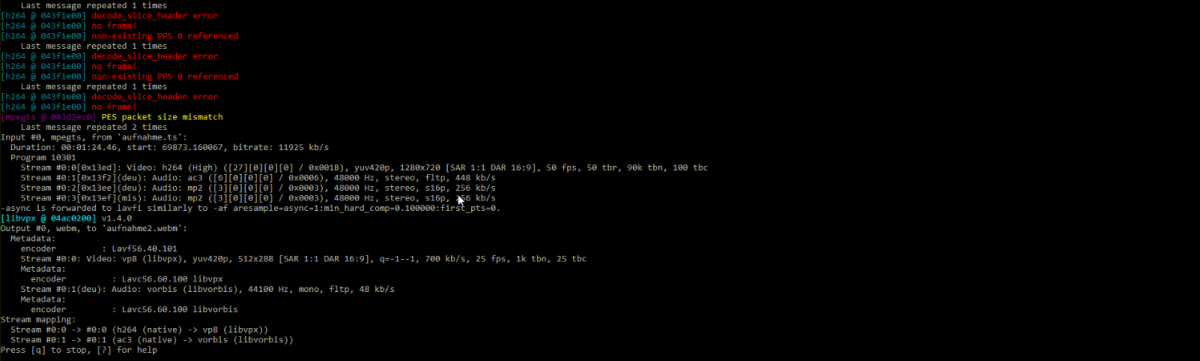 Griga Posted December 10, 2015 Posted December 10, 2015 Könnte es sein, dass es der Empfang bei dir nicht ganz störungsfrei ist, es also zu Aussetzern kommt? Die anfängliche Serie von Fehlermeldungen ist eigentlich normal - es ist dadurch bedingt, dass ffmpeg mitten in einem Stream einsetzt und erst mal Video-Header finden muss - aber PES packet size mismatch gefällt mir nicht. Sowas passiert eigentlich nur bei Aussetzern (= fehlenden Daten) im Stream. ich frage einfach mal: was soll die Option "cpu-used 15" bewirken" ? Es gibt da neuerdings eine Suchmaschine namens Google... http://www.webmproject.org/docs/encoder-parameters/ Abschnitt 2. Encode Quality vs. Speed