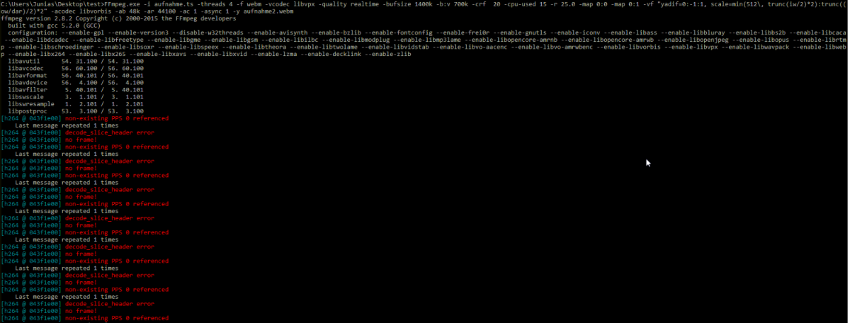 Junias Posted December 10, 2015 Author Posted December 10, 2015 Hi, ich denke wir kommen dem Problem näher... Also, ich hab die Tests mit der Aufnahme mal ausgeführt, habe dabei folgende Konfiguration verwendet: - FFmpeg - aufnahme.ts mit 122Mb und 1:24 Minute Das erste Kommando (FFmpeg.exe -i "aufnahme.ts" aufnahme.webm) läuft ohne zu murren durch, und erstellt mir (auch wenns recht lange dauert) die Datei aufnahme.webm mit 3MB, welche abspielbar ist. Also alles gut. Das zweite Kommando (das sehr lange) läuft nicht durch. FFmpeg stürtz nach ca. 2 Sekunden ab (FFmpeg.exe funktioniert nicht mehr). Getestet sowohl mit Anführungszeichen als auch ohne, bei beiden dasselbe ergebnis. Habe euch mal den Log der Consolenausgabe angehängt... Hier sieht man schön, dass dauernd dasselbe wiederholt wird... das passiert noch deutlich öfter, dashabe ich der kürze halber da mal rausgestrichen... Nach allen Kommandos schmiert dann FFmpeg ab... Getestet auf dem Desktop mit Lese-/Schreibrechten