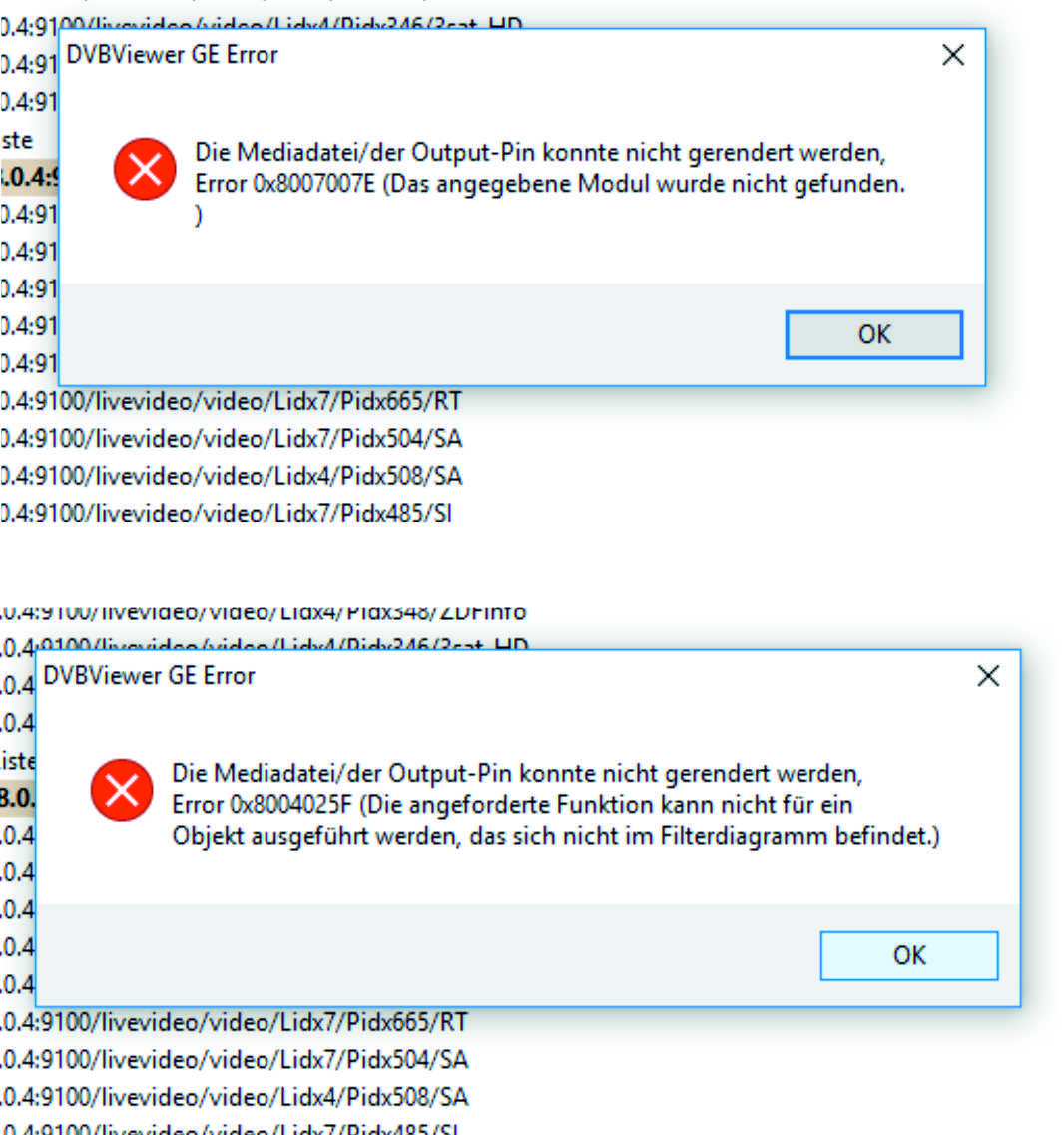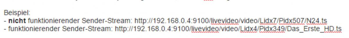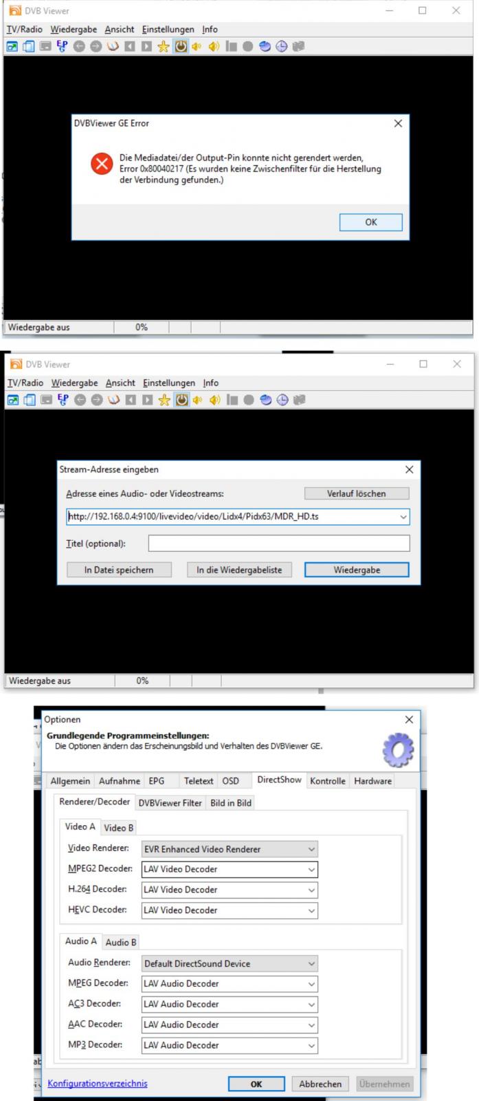 ultragun Posted December 5, 2015 Author Posted December 5, 2015 Hallo nochmal. Wie schon erwähnt, gehen die HD+ -Sender nicht. Ist ja auch klar, da wohl die Sache nur mit CI-Karte funktionieren könnte. Habe ich jedoch nicht am PC. Deshalb versuchte ich jetzt eine Playlist zu generieren, die nur SD-Programme der Privaten beinhaltet. Dabei geht leider keines dieser Programme. Beispiel: - nicht funktionierender Sender-Stream: http://192.168.0.4:9100/livevideo/video/Lidx7/Pidx507/N24.ts - funktionierender Sender-Stream: http://192.168.0.4:9100/livevideo/video/Lidx4/Pidx349/Das_Erste_HD.ts Folgende Fehlermeldungen erscheinen beim klick auf den Sender in der Senderliste: Quote