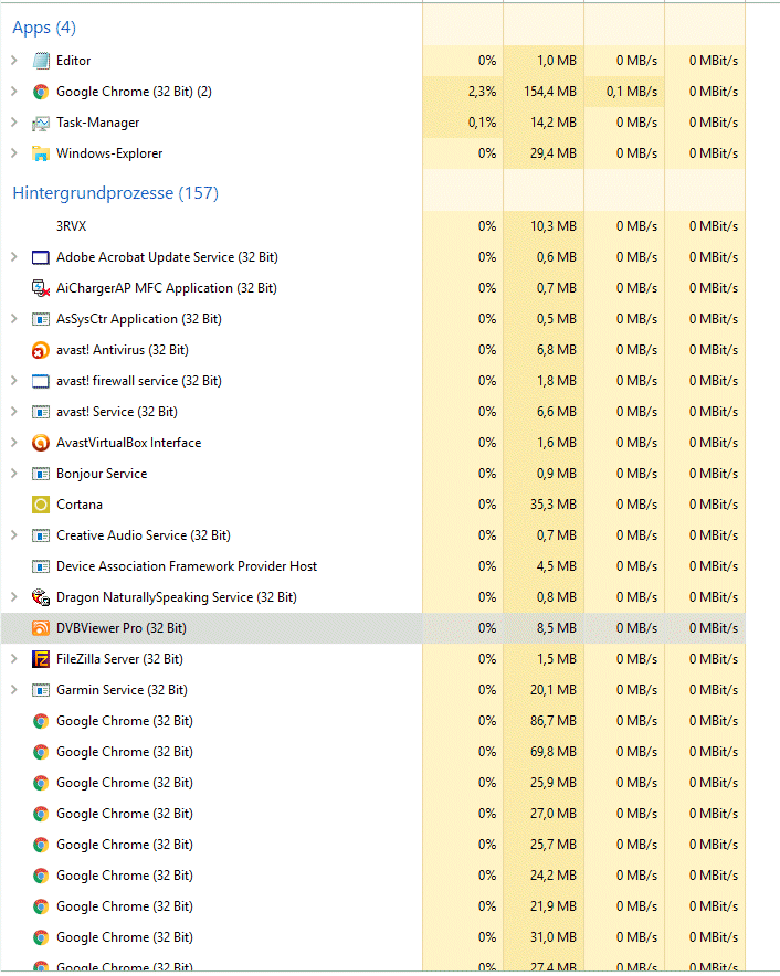 jpsaf Posted December 18, 2015 Author Posted December 18, 2015 Hallo danke für die Tipps; ich habe die unter C:\Users\ BENUTZER \AppData\Local\VirtualStore\ die mit dem DVBViewer zu tunenden Dateien gelöscht. Dann habe ich AVAST komplett deinstalliert. Dann habe ich DVBViewer deinstalliert. Dann habe ich DVBViewer installiert. Ergebnis: Leider immer noch zwei mal (ganz kurz hintereinander) gibt es das Kreissymbol und sonst nichts passiert. DVBViwer ist im Taskmanager. Übrigens kann ich den unter details die Prozesstruktur nicht beenden - muss also neu starten. Unter c:\Users\[uSER]\AppData\Local\VirtualStore\ geschaut, da ist nichts angelegt worden ... Quote