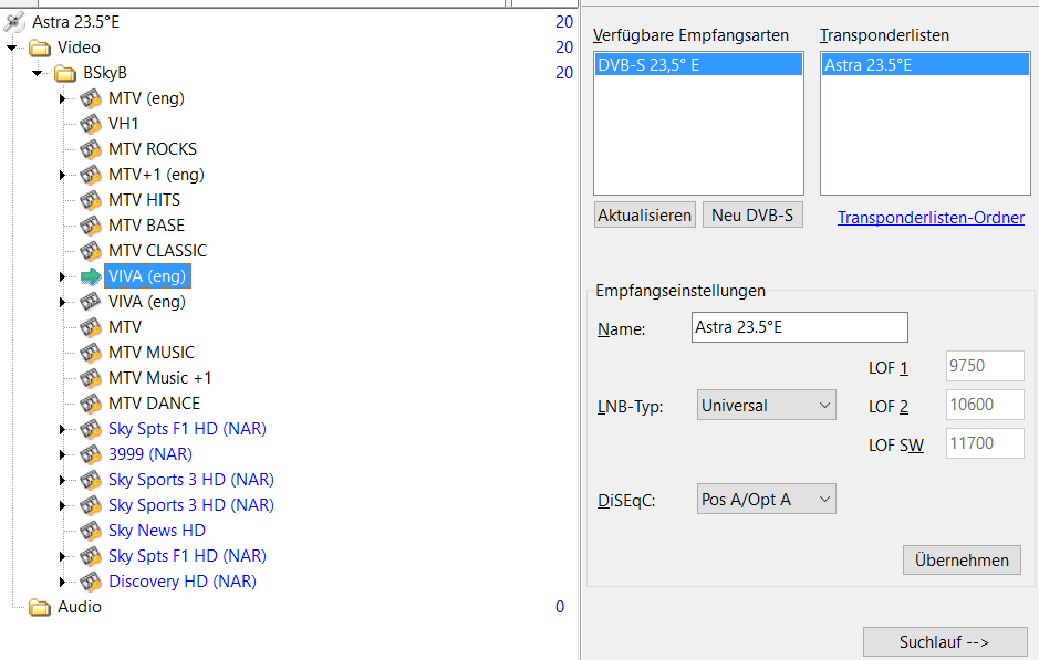 dvbisti Posted March 6, 2016 Posted March 6, 2016 (edited) Hallo, ich arbeite als Journalist und müsste jetzt auf ein Newsfeed zugreifen, der Montagabend gesendet wird. Wir arbeiten hier mit einem Sundtek Sky V mit DVBViewer Pro und mit einem Selfsat H50. Ich hätte jetzt einige Verständnisfragen: In der Beschreibung ist 6,11113 MSym angegeben, in DBV Viewer sind aber die Angaben in Ksym. Wie rechne ich es genau um? Hier sind die Daten des Feeds ====================================================================== Europe - live feed Datum: 07. März 2016 Time: 19.00 – 22.00 MEZ LIVE Satellit: Eutelsat Astra 3B @ 23,5° Ost Tr. 3.021 – Ch A9 – 9 Mhz Downlink Frequenz: 12.671,500 MHz Downlink Polarisation: horizontal (X) Line-up via Astra Access Center, (5 Min. vor Übertragungsbeginn) Encoding: MPEG2 4:2:0 DVB-S / QPSK SR: 6.1113 Msym/s FEC 3/4 In the clear ===================================================================== Ich habe schon versucht die DVB-S_0235.ini zu bearbeiten und etwas zu finden aber nichts gefunden. Der normale Suchlauf findet nur diese Sender, die ihr auf dem Screenshot sieht. Hat jemand eine Idee wie ich wirklich alle Transponder der Satellite finden kann? Vielen Dank für Eure Hilfe. Dvbisti Edited March 6, 2016 by dvbisti Quote